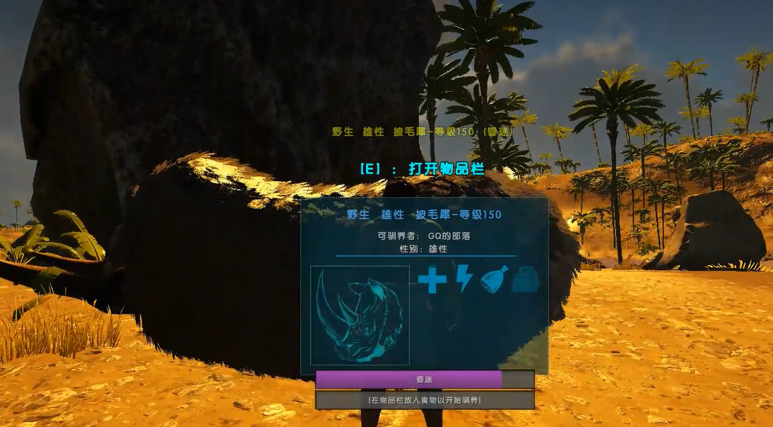 值得注意的是,并不是所有恐龙都能用击晕的方式驯服。有少数几种恐龙需要用和平的方法。比如麝足兽就不能打晕,要把它喜欢的食物放在快捷栏的0号位置,然后慢慢靠近它进行喂食。等它饿了再继续喂,反复几次就能驯服了。