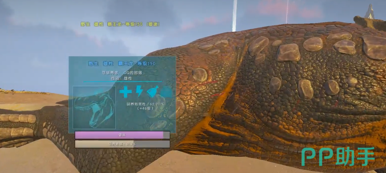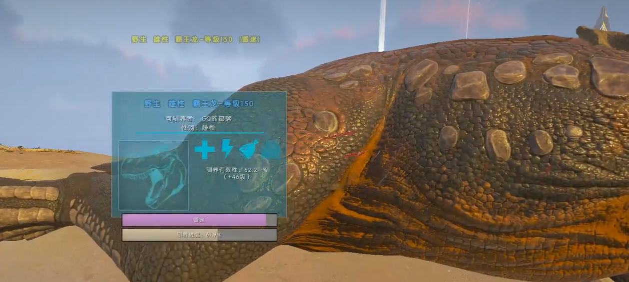 等到金色的进度条涨满,就说明驯服成功了。这时候恐龙就正式成为你的伙伴,可以给它起个名字,以后带着它一起冒险。驯服成功的恐龙用处非常大。可以当做坐骑骑着到处跑,移动速度比走路快多了。而且恐龙还能帮忙运输物资,相当于一个移动的大背包。有些战斗力强的恐龙,还能在打架的时候帮你一起战斗。