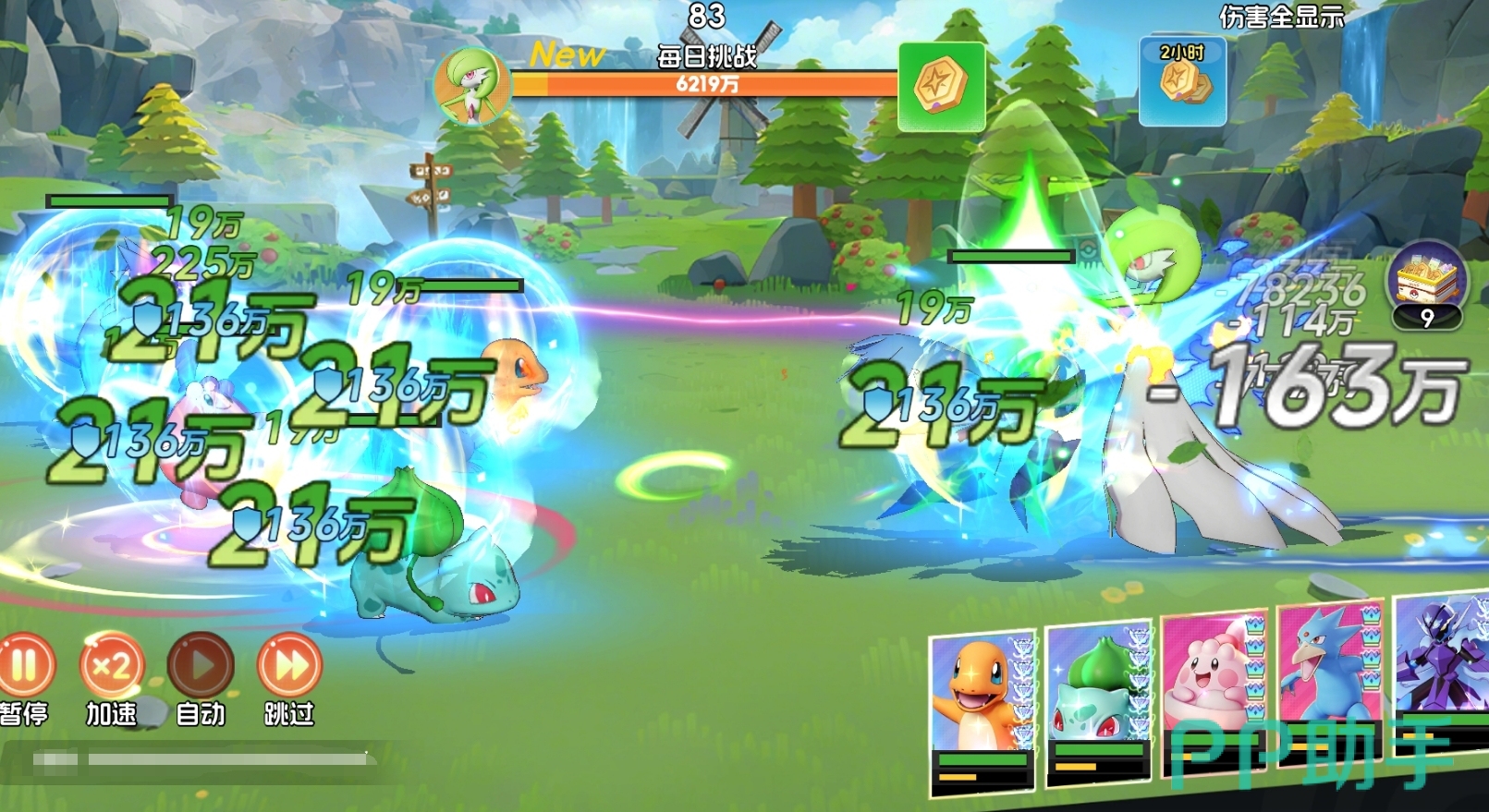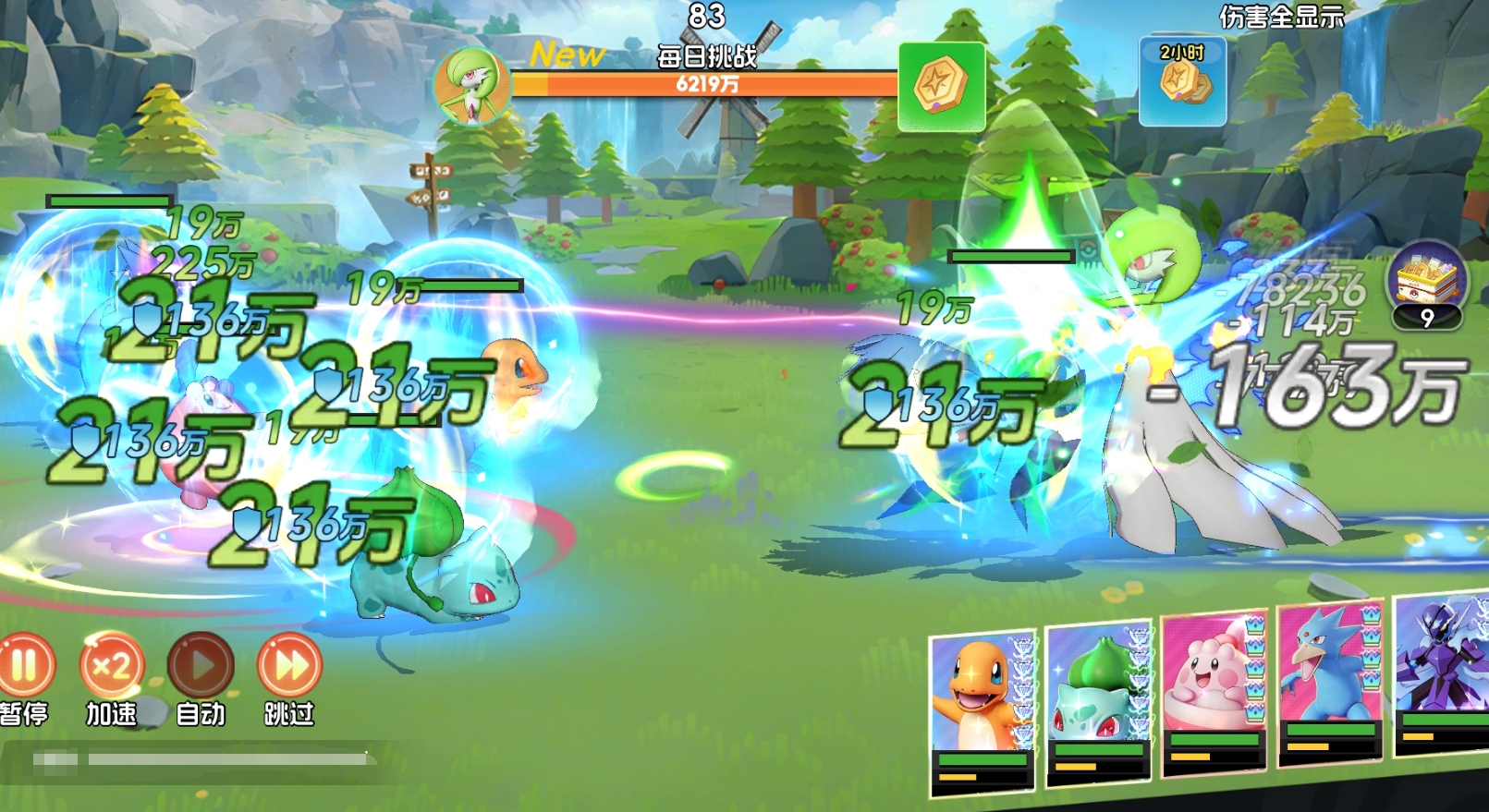 开始战斗后,玩家们会进入战前准备阶段,此时可根据所需挑战的宝可梦boss,来更改自己的挑战阵容,还可进行战术安排和添加应援团,确保自己的阵容能打出更高的伤害。若玩家练的宝可梦比较多,比较建议在此阶段更换一套可对宝可梦boss产生阵营克制效果的阵容,这样能打出的伤害更高。正式挑战时,玩家可开启自动让宝可梦们自行作战,也能直接选择跳过查看本场战斗的结果和宝可梦们打出的最终伤害。