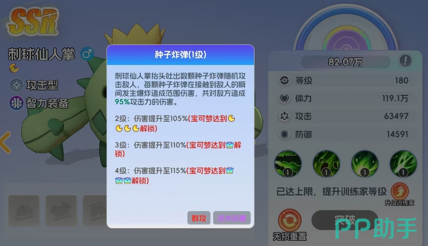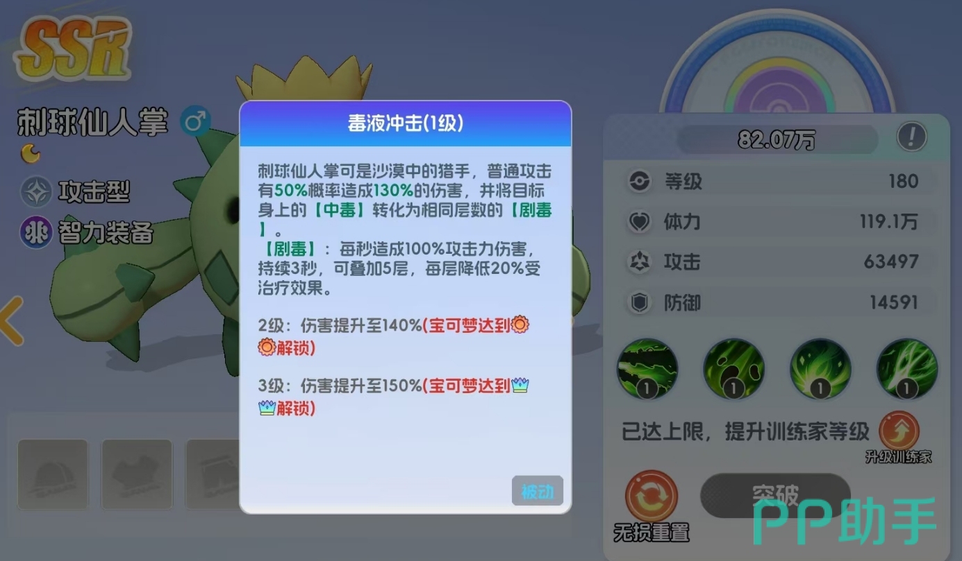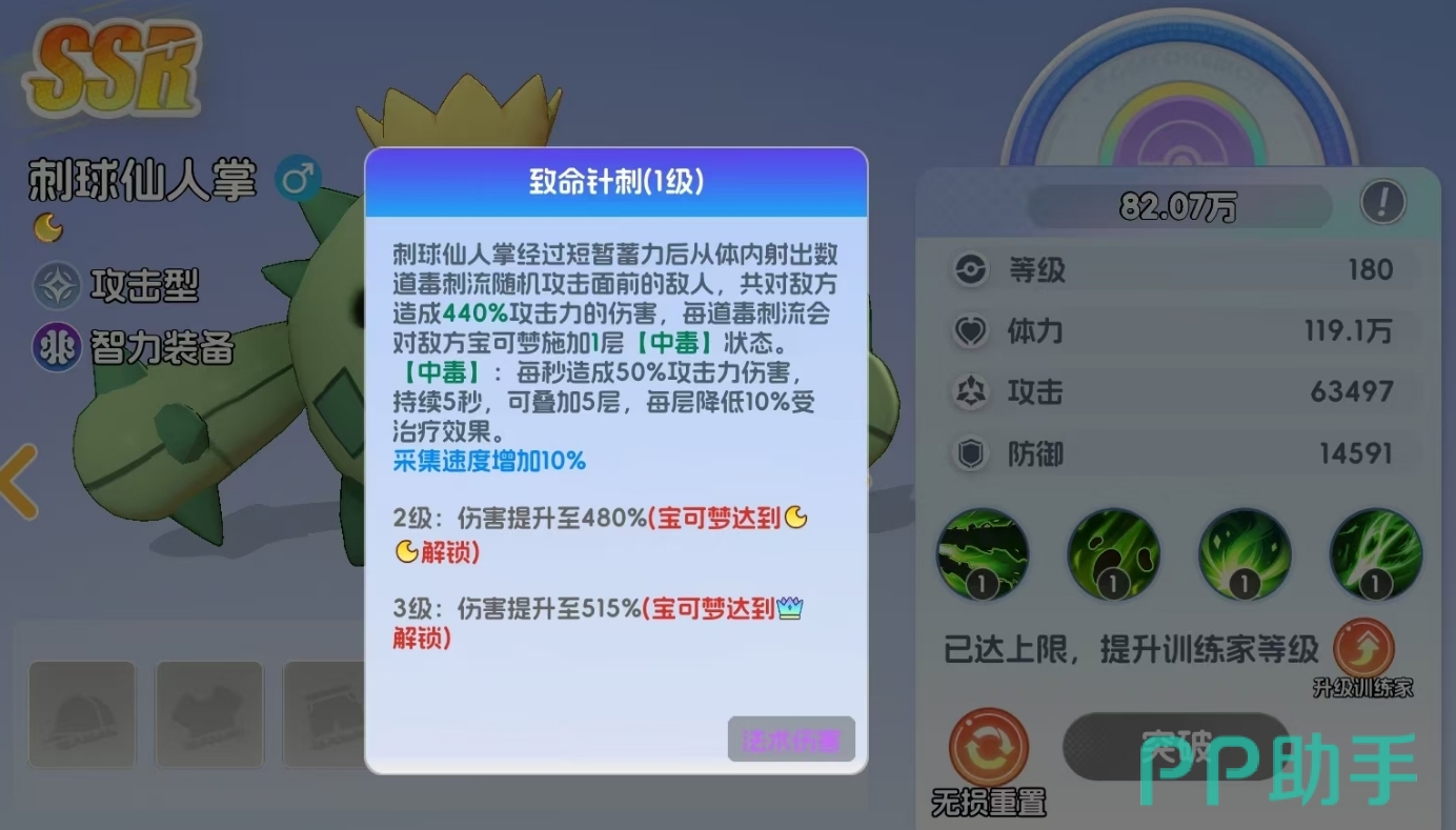 总的来说刺球仙人掌是实用性很高的SSR宝可梦,其对敌人施加的中毒效果和剧毒效果会极大减弱敌人的持续作战能力,且自身的伤害也并不低。宠物集结刺球仙人掌好用么已经为各位分享完,希望本篇攻略能帮各位更好地了解这只宝可梦。