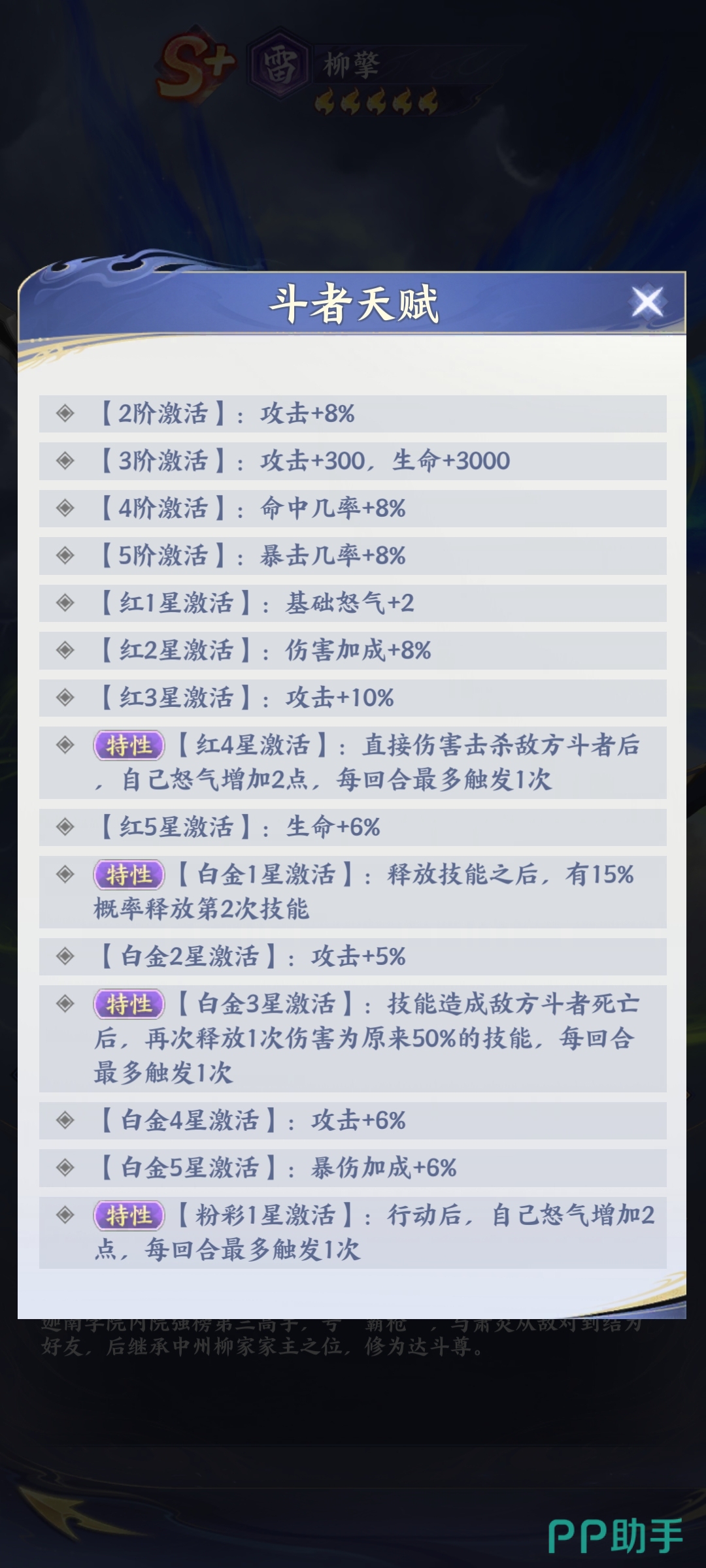 柳擎的天赋是层层递进的,其实他每激活一次都能够让自身的实力加强,一旦升到红四星的时候,在击杀敌人之后,能够快速的回复怒气值。当他到达白金一星的时候,他一旦释放技能,将会有一定的概率再次释放技能,所以说他的这些天赋其实跟他的定位是有效结合的,因此在战斗的时候将会形成输出循环。