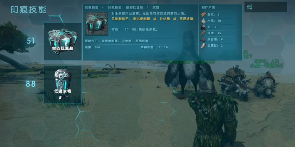把这些材料都准备好以后,就可以去方尖碑制作低温舱了。走到方尖碑跟前,打开制作界面就能看到低温舱的选项。把材料放进去,点击制作就行。做好低温舱以后,记得驯服的恐龙收进去,然后骑上老鹰直接飞到新家那边。到了新地点以后,把低温舱里的恐龙放出来,这样搬家就方便很多了。
