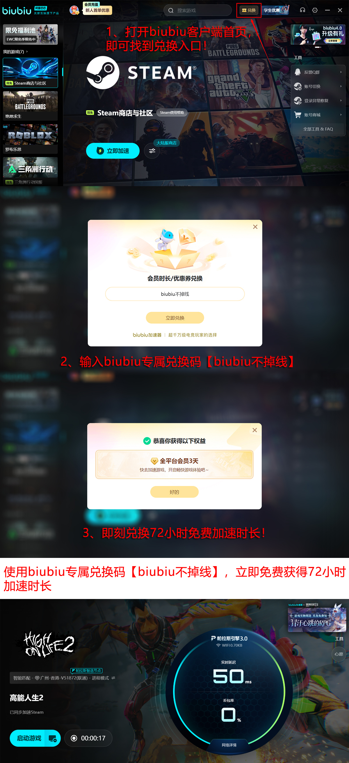 当前新老用户均可享受限时加速福利:在biubiu加速器客户端内输入兑换码【biubiu不掉线】,即可立即领取72小时全游戏加速时长;新用户完成注册并首次登录后,系统将自动发放24小时通用加速权限。两项权益可叠加使用,新用户最高可获得96小时免费加速服务,充分覆盖游戏预载、首发冲榜及深度探索阶段的网络需求。