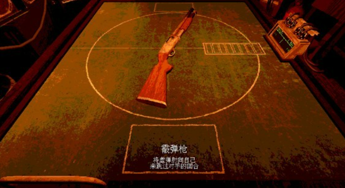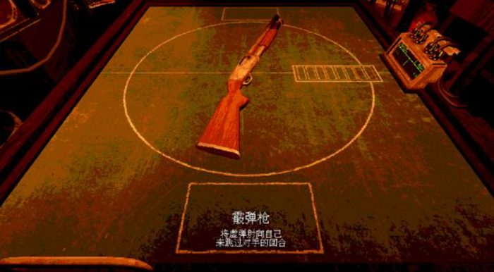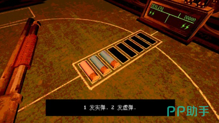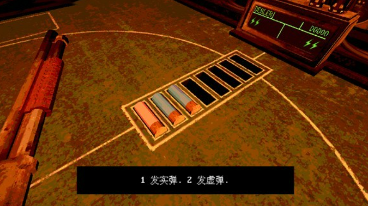 准备阶段结束后,所有玩家会被带到一个比较压抑的场景里面。游戏开始前会有个免责声明,需要玩家签上自己的昵称才能继续。签完名之后正式进入对局,这时候恶魔会出现在对面,桌子中间放着那把关键的散弹枪。每一局开始的时候,屏幕上会清楚显示这一轮枪里装了多少发实弹,多少发空包弹。比如第一回合可能是两发空包弹加一发实弹,后面的回合实弹数量会逐渐增加,难度也就越来越高了。