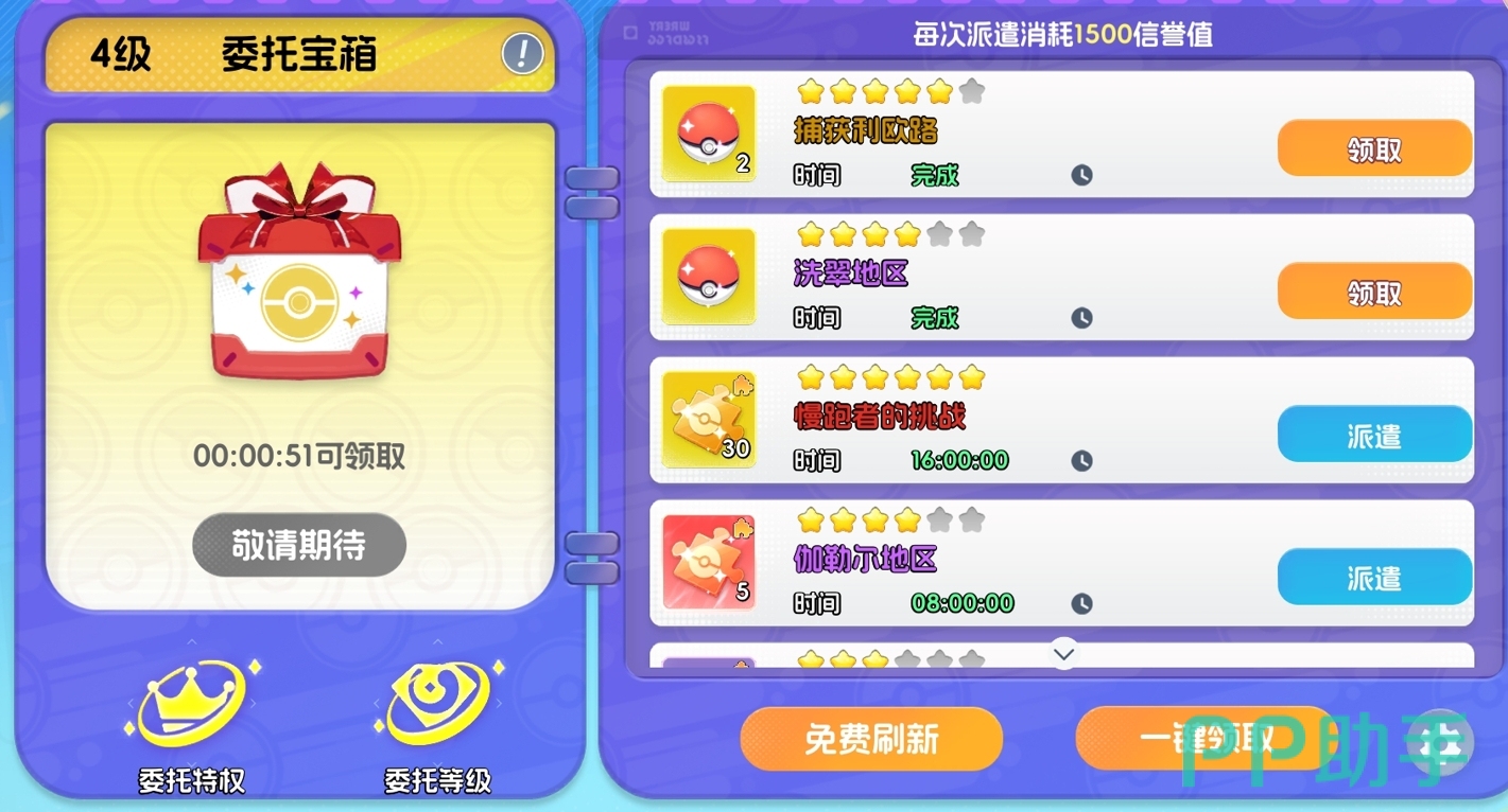 这些派遣任务完成起来也很简单,人们接取想要完成的任务后,只需选择合适的宝可梦,便可派遣它去执行任务,等时间到后就能领取任务的奖励。每次派遣都需要消耗1500的信誉值,信誉值不足时无法接取任何派遣任务,玩家们可通过多种方法来进行信誉值的获取,无论是推图还是领取挂机资源都能拿到,产出途径很多且产量非常大,所以不用担心出现信誉值不足的问题。