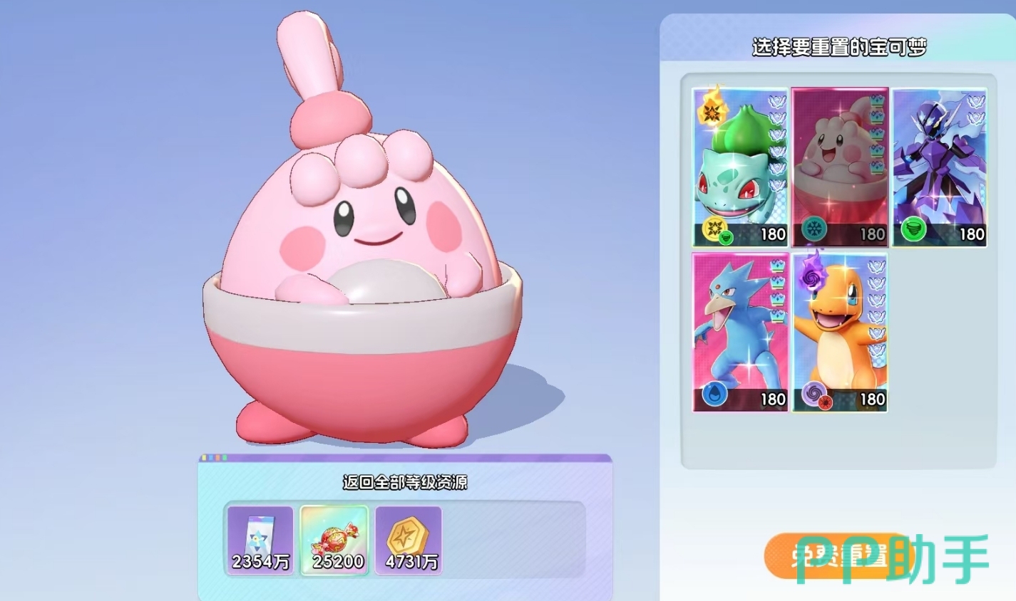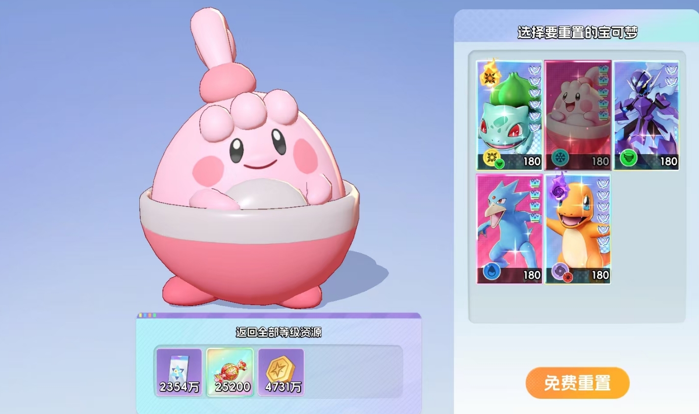 同时,游戏还提供了无损重置功能,使用后可返还玩家已投入的所有养成资源,玩家们若是练错了宝可梦,可使用该功能将宝可梦的练度重置。若玩家们通关了探险关卡4-20,还可在宝可梦基地里开启共鸣功能。该功能会选择五只等级最高的宝可梦作为共鸣对象,将它们的等级共享给其他的宝可梦。共享等级同样能帮助宝可梦们解锁各项养成功能,与直接练上来的等级没有任何区别,因此玩家最多只需养五只宝可梦,其他宝可梦就交由共鸣功能来帮助它们进行等级的提升。