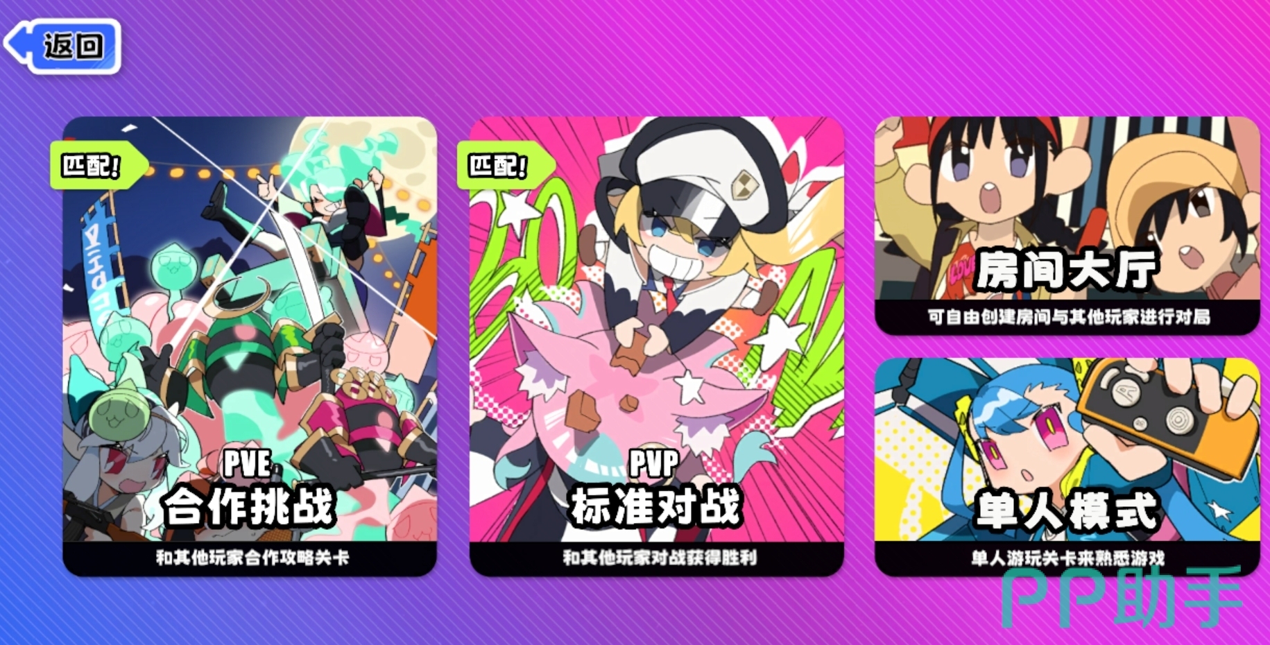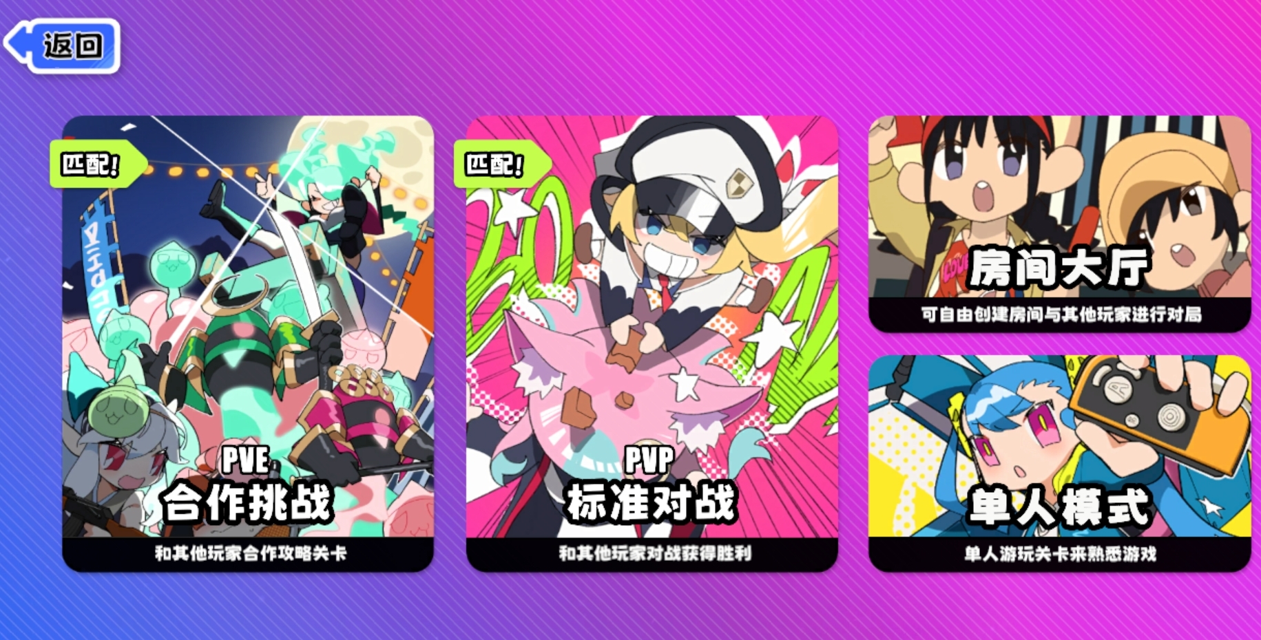 吉星派对里的玩法模式主要有合作挑战(PVE模式)和标准对战(PVP模式)两种,其中合作挑战需要玩家与他人进行合作,解决掉地图里的BOSS敌人便能过关,反之则会挑战失败。而标准对战则更偏竞技性一些,每位参与的玩家将各自为战,谁能先通过累积星币升到三星,便可赢下对局的优胜。倘若各位不想通过匹配来参与游戏,也能前往房间大厅去寻找自己想要进入的房间参与对战,亦或是开设好房间后拉朋友一同游玩。同时,吉星派对还提供了单人模式,玩家能在该模式里熟悉各地图的机制,也能练习各角色的用法。