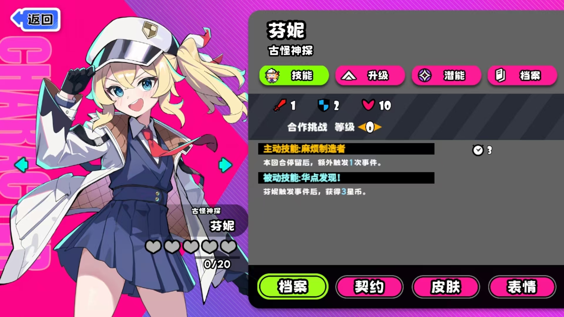 每次参与对局时,人们都可在自己已获得的角色中选定一位参与游戏。每位角色的能力都很独特,他们的技能分为主动技能和被动技能,其中主动技在使用后都会需要一定时间进行冷却,而被动则全局生效,部分角色在不同的模式中有着完全不同的技能组,各位在使用这些角色参与对局时一定要注意区别。此外,角色还能通过升级来得到强化,部分角色更是可通过激发潜能来突破自己的潜力,以更强的姿态去参与对局,这些均是人们养成角色时需要格外注意的地方。