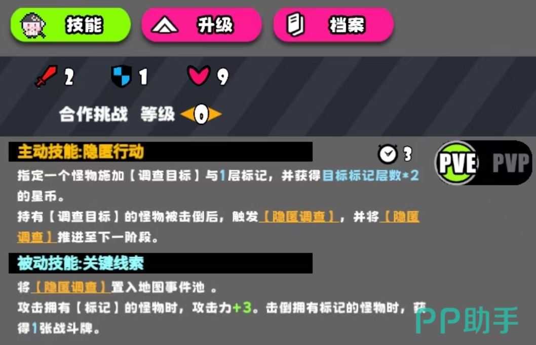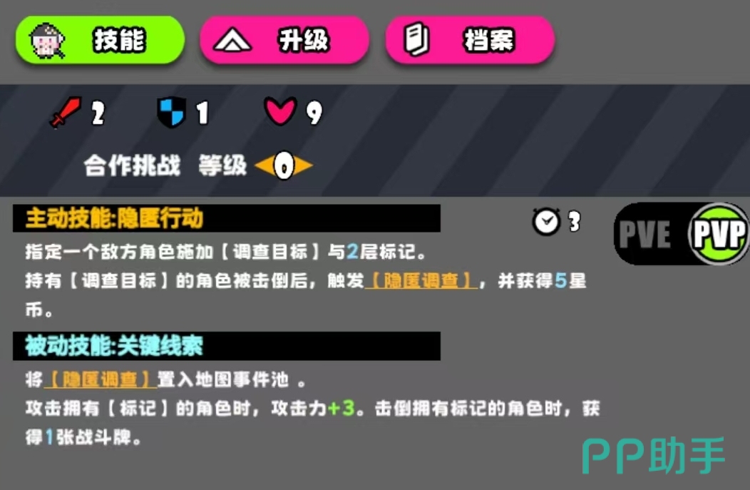 而在PVP模式里,邦妮同样可施加标记,只是施加对象从怪物更改为了其他玩家,隐匿调查也将不会拥有多个阶段,但会在邦妮击倒拥有标记的玩家后,为全体玩家都挂上2层标记,且邦妮自身能额外获得5星币的收益。同样的,邦妮攻击有标记的玩家时,一样能像PVE那样享受攻击3、击倒额外获得一张战斗牌的效果。所以,邦妮在PVP里的玩法也很直观,那就是尽可能地击败有标记的玩家,争取为所有人都挂上较高层数的标记。
