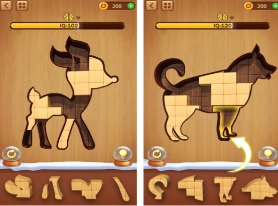 以几何图形拼合为核心的休闲单机作品。规则简洁明了,仅需将不同形状的模块拖入指定区域并严丝合缝嵌套,即可完成关卡。题面设计兼顾创意性与合理性,图案库包含猫咪、小狗等拟人化动物形象,画风清新可爱。所有内容本地加载,不依赖网络,适合通勤、候车等无网环境持续游玩。