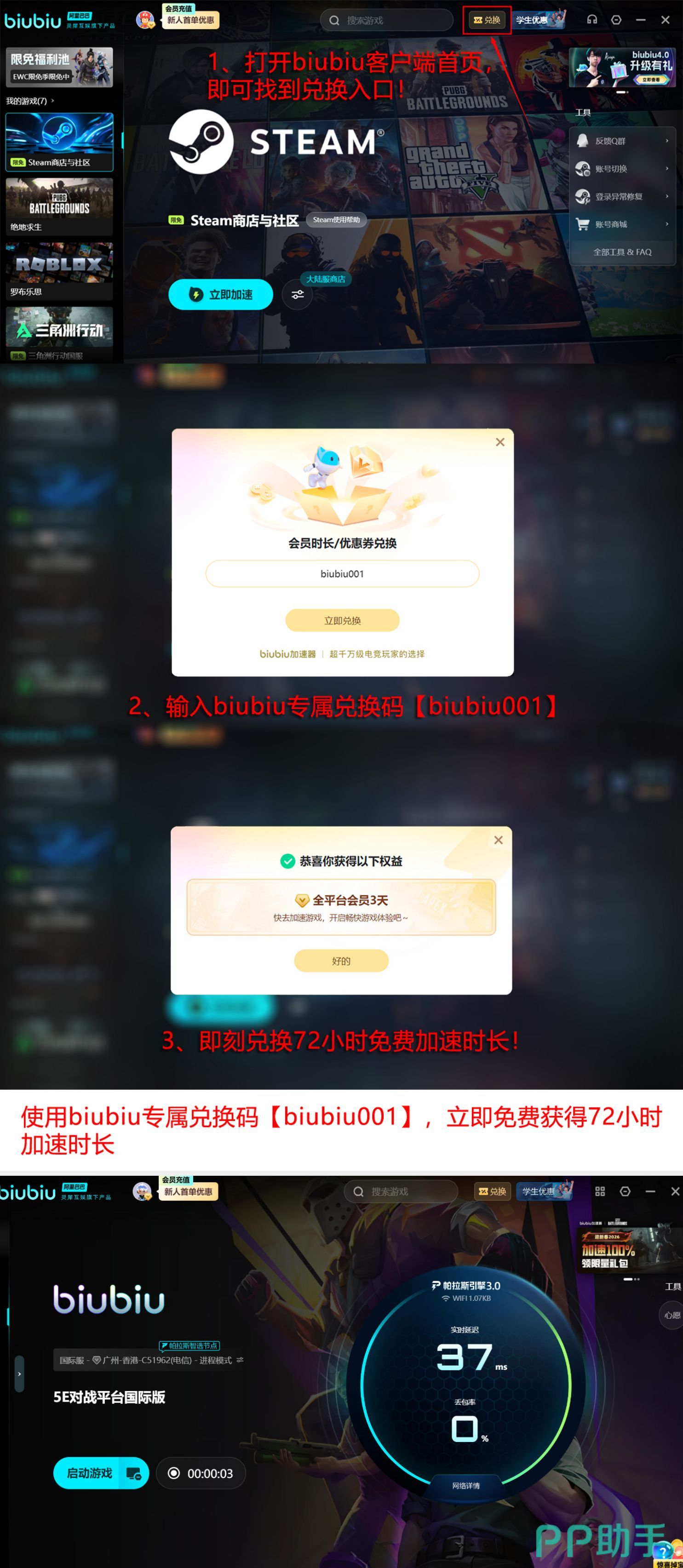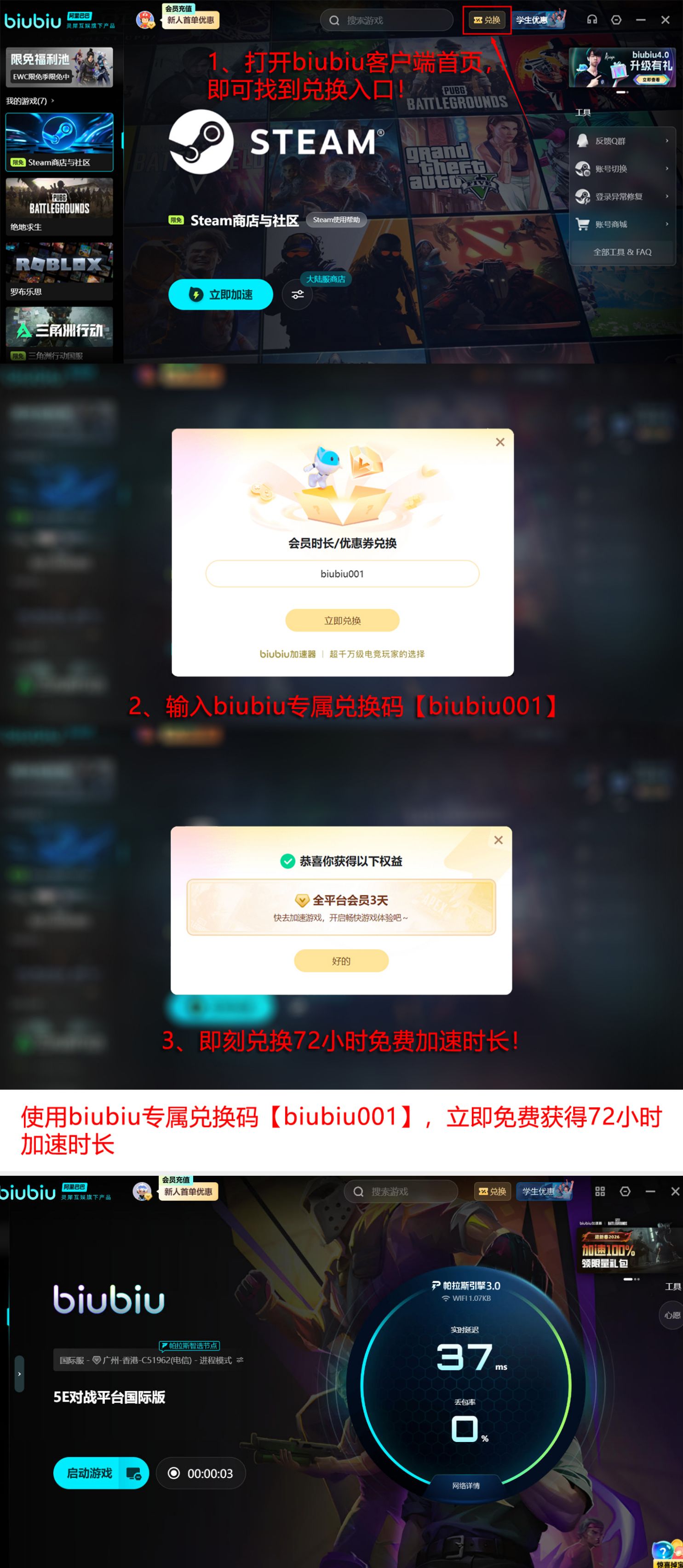 该加速器深度适配5E平台底层通信机制,已成pero战队日常训练指定工具,并获PUBG职业选手小叮当公开推荐。在各类大型线上赛事及高强度匹配中,持续提供毫秒级延迟控制与画面帧率稳定性,确保角色动作顺滑、场景渲染连贯。目前平台推出限时福利:新老用户输入口令【biubiu001】即可领取免费加速三天;新用户完成注册还可额外解锁24小时加速时长,两项叠加总计可享96个小时免费使用权益。