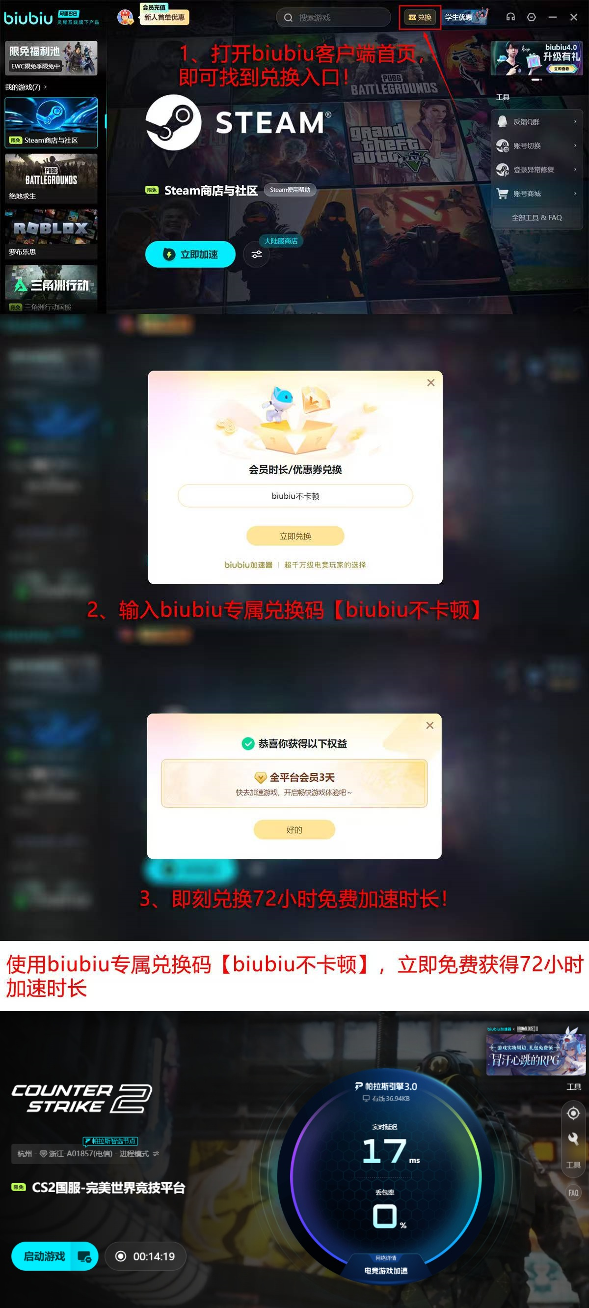 除基础加速能力外,当前版本提供限时福利:输入兑换码【biubiu不卡顿】,即可激活72小时全功能加速权限;新注册用户额外叠加24小时体验时长,总计96小时免付费使用。加速器内置游戏库覆盖超2000款主流PC及移动端游戏,CS2、PUBG、Valorant、Apex Legends等FPS品类全部预设优化策略,无需手动配置节点,一键启用即生效。