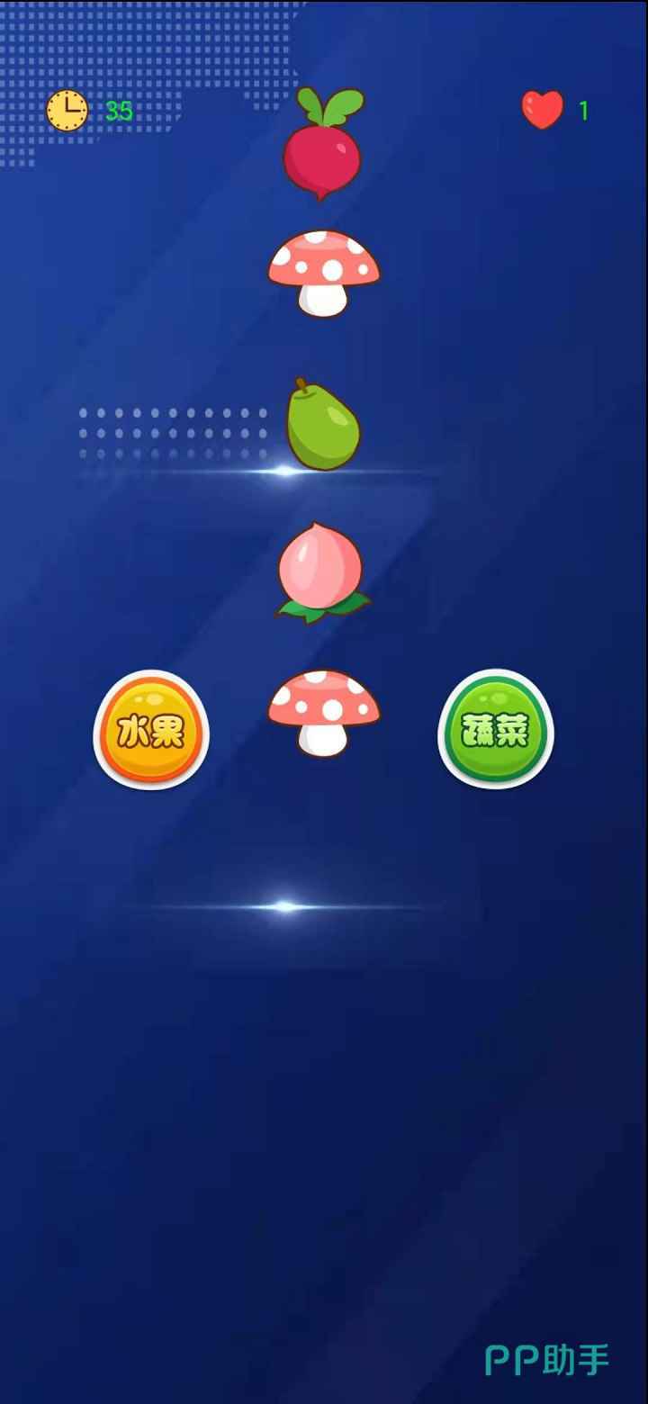采用卡通化UI设计,背景色彩明快活泼。玩法结合图像观察与文字提示,要求玩家在纷杂果蔬混投中快速辨识并点击对应分类按钮。例如:草莓与土豆同时下落,需依据表皮特征、形状结构准确归类。该机制有效提升对果蔬典型属性的认知效率,同步强化视觉分辨与手眼协调能力。