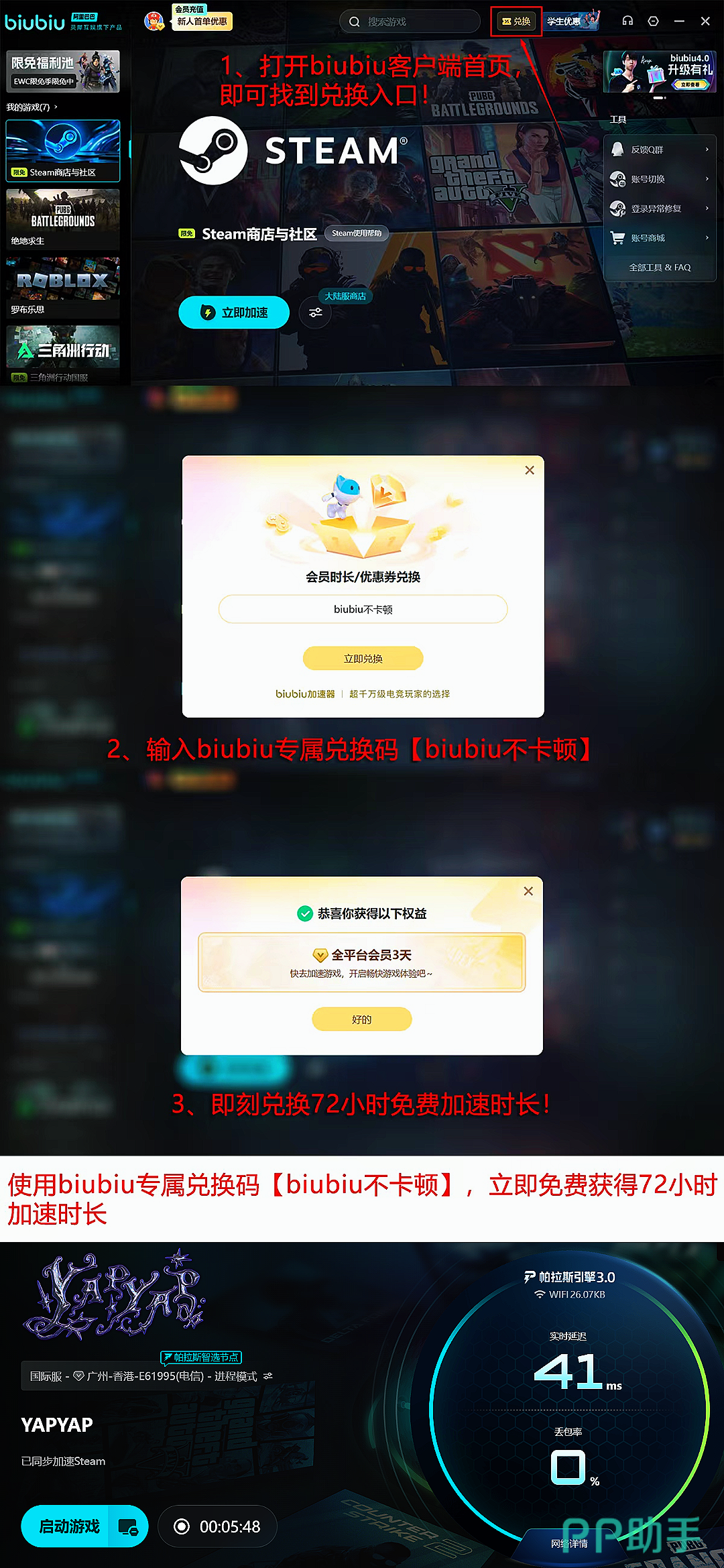 平台为新老玩家准备了专属福利,全部用户只需输入兑换码【biubiu不卡顿】,即可额外领取3天免费加速时长;新用户注册后直接解锁24小时全场游戏免费加速权益,叠加福利后更能享受到96小时的免费加速。