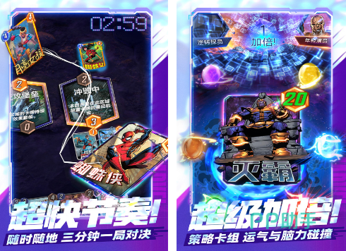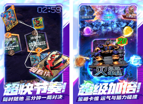 同样是一款由漫威中很多人物的手游,也是官方正版授权的,无论你是想要在这里面看到金刚狼或者是蜘蛛侠等角色,应有尽有,有超多数量的英雄变体角色。将通过卡牌的这一种方式构建强大的组合,发挥自己的创造力。虽然每个人只有12张卡组,不过却能够利用强大的创造力,在每一次回合制的战斗当中,与敌人斗智斗勇。