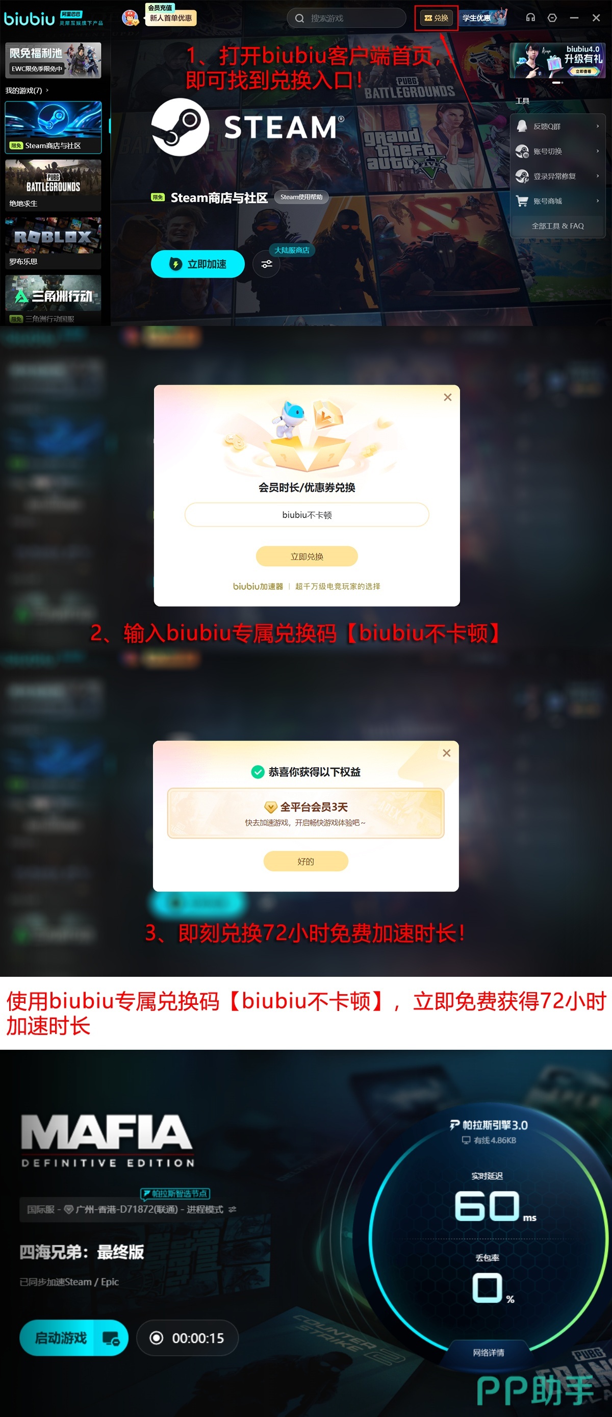新用户注册即可获赠24小时全功能免费试用权限,覆盖《四海兄弟:最终版》《绝地求生》《Apex英雄》等主流PC端游,以及部分Switch模拟器联机场景与安卓云游戏平台。输入专属兑换码【biubiu不卡顿】,还可额外领取3天加速时长。首登用户叠加权益后,总计享有96小时无限制体验周期,充分评估产品适配性后再决定是否开通长期服务。