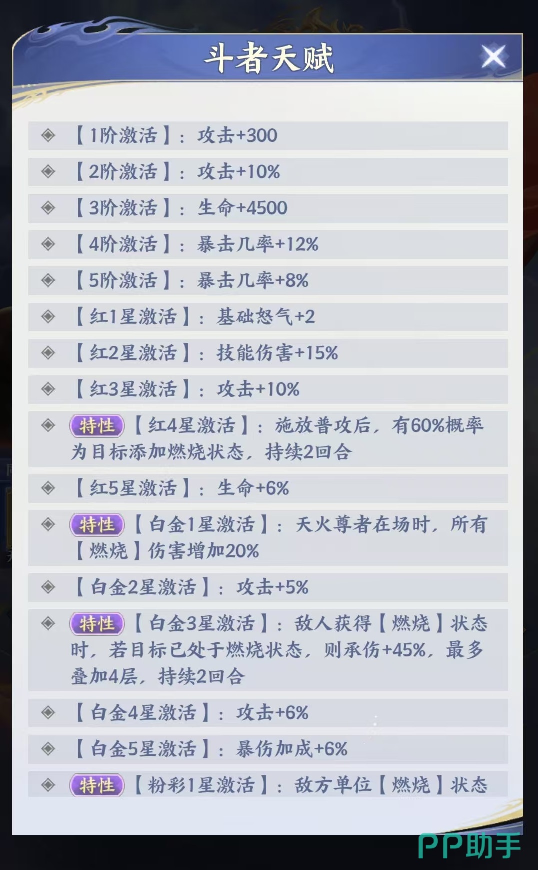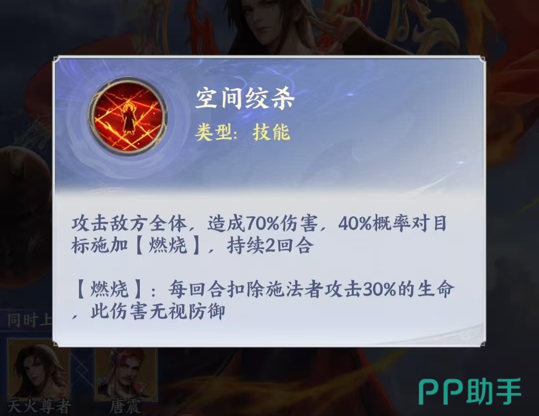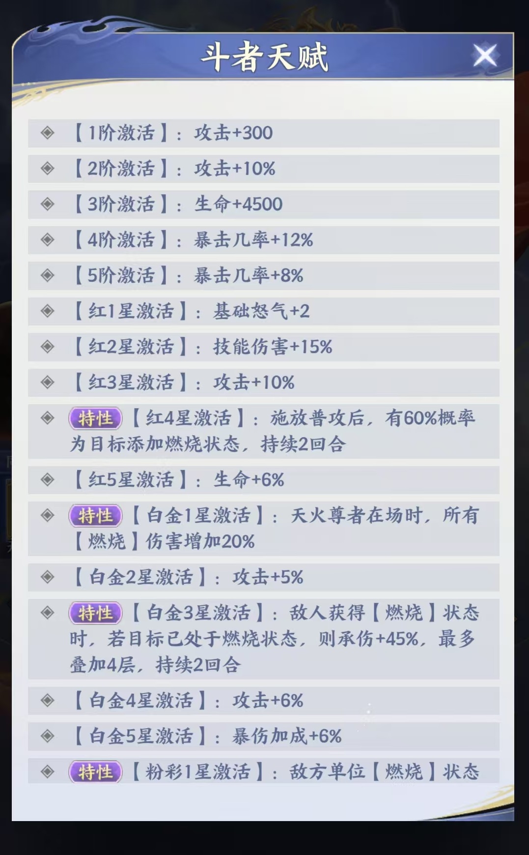 其主动技能“空间绞杀”可对敌方全体造成基础伤害,并有概率施加持续两回合的【燃烧】状态。该效果每回合依据施法者30%攻击力结算真实伤害,完全无视目标防御属性。随着星级提升,天火尊者持续强化灼烧体系:红四星阶段,普攻亦可触发燃烧;白金一星起,全场燃烧伤害提升20%;白金三星时,若目标已处于燃烧状态,则额外触发一次伤害判定;粉彩一星后,当某单位燃烧效果被清除或驱散,该状态将自动蔓延至相邻敌人。