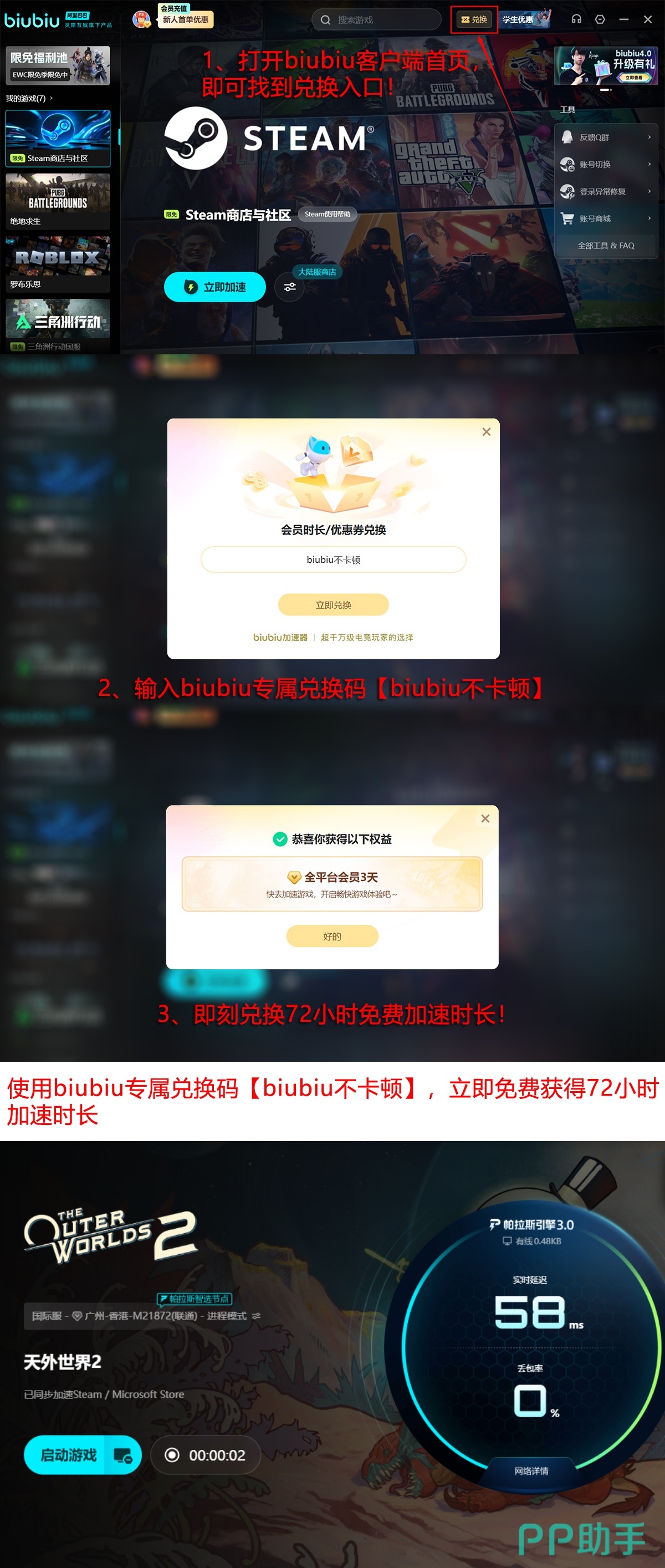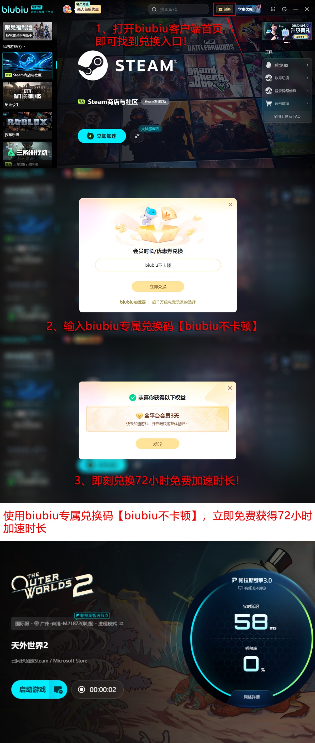 除PC端加速外,biubiu亦覆盖Nintendo Switch平台联机场景,兼容《天外世界2》Switch云游戏版本所需的低延迟传输协议。新注册用户可直接领取24小时全功能试用权限;所有账户输入激活码【biubiu不卡顿】,即可额外获得72小时加速时长,两项权益叠加后总计享有96小时无限制加速服务,便于充分测试实际效果。