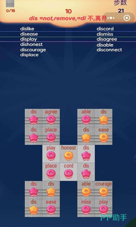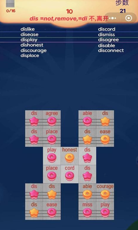 本作创新性地将经典消消乐玩法与英语构词法相融合。游戏主体为糖果造型图标,每个图标标注单个或两个英文字母。玩家通过组合相邻字母块完成单词拼写并触发消除,成功后目标单词实时显示于屏幕顶部,同步附带中文释义。每一次有效消除即对应一个新词汇的输入过程,实现“操作—认知—理解”闭环,长期游玩可稳步拓展基础词汇储备。