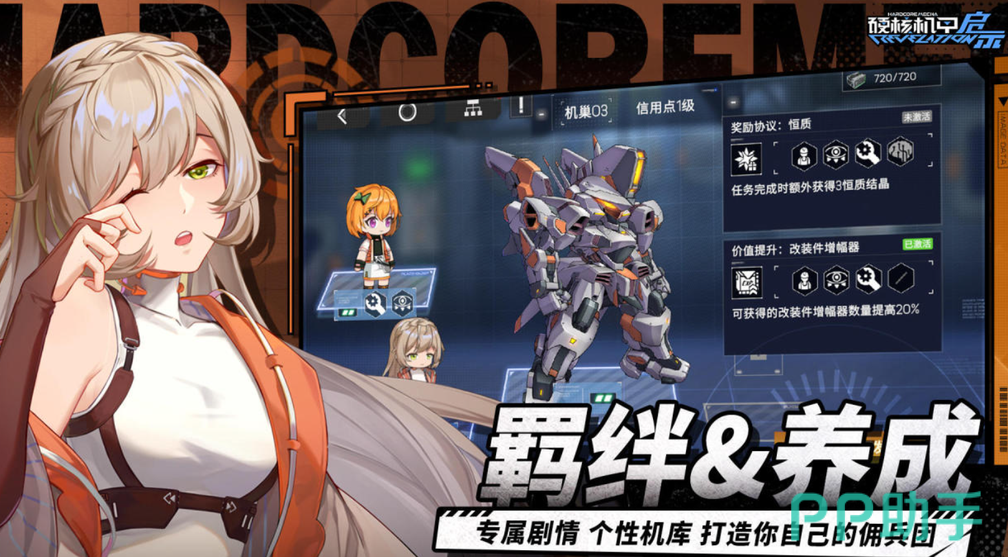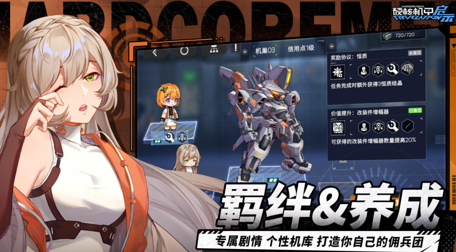 二次元美术风格与硬核机甲设定深度融合,角色立绘由日本知名插画师团队监修。羁绊系统关联24位可攻略角色,每位角色拥有独立语音库(含300+句台词)与专属机甲涂装。剧情推进解锁“启示协议”系统,可调用卫星轨道炮、纳米修复云等战略级支援能力。
