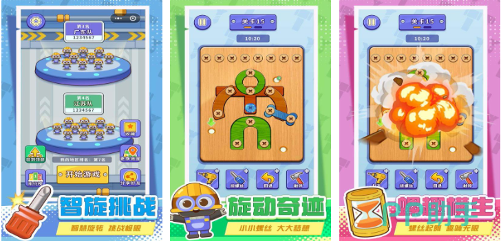 本作将工业元素巧妙融入解谜框架,围绕螺丝、螺母、铆钉等基础机械部件构建关卡逻辑。玩家需依据物理结构关系,判断拆卸顺序与受力方向,逐步解除障碍。画面采用明亮卡通风格,降低理解门槛;而随进度提升的关卡难度,则持续激发空间推理与步骤预判能力,兼具知识性与娱乐性。