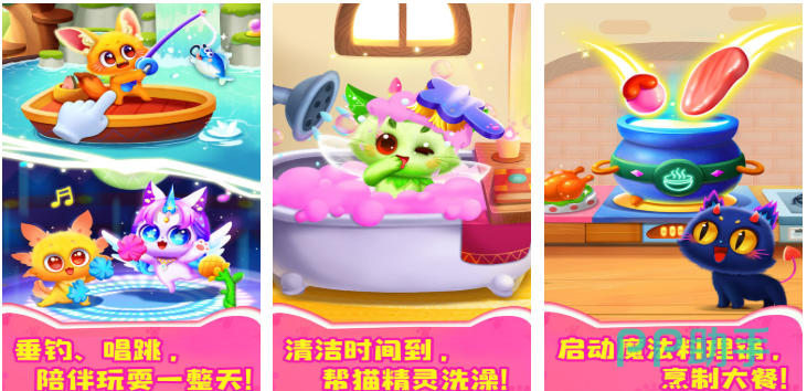 基于动物行为学原理设计宠物养护体系,包含清洁护理、喂食管理、玩具互动、健康监测四大功能模块。猫咪拥有饥饿值、清洁度、亲密度三维状态条,皮肤更换支持季节主题与节日限定款,所有行为反馈符合幼童认知逻辑。