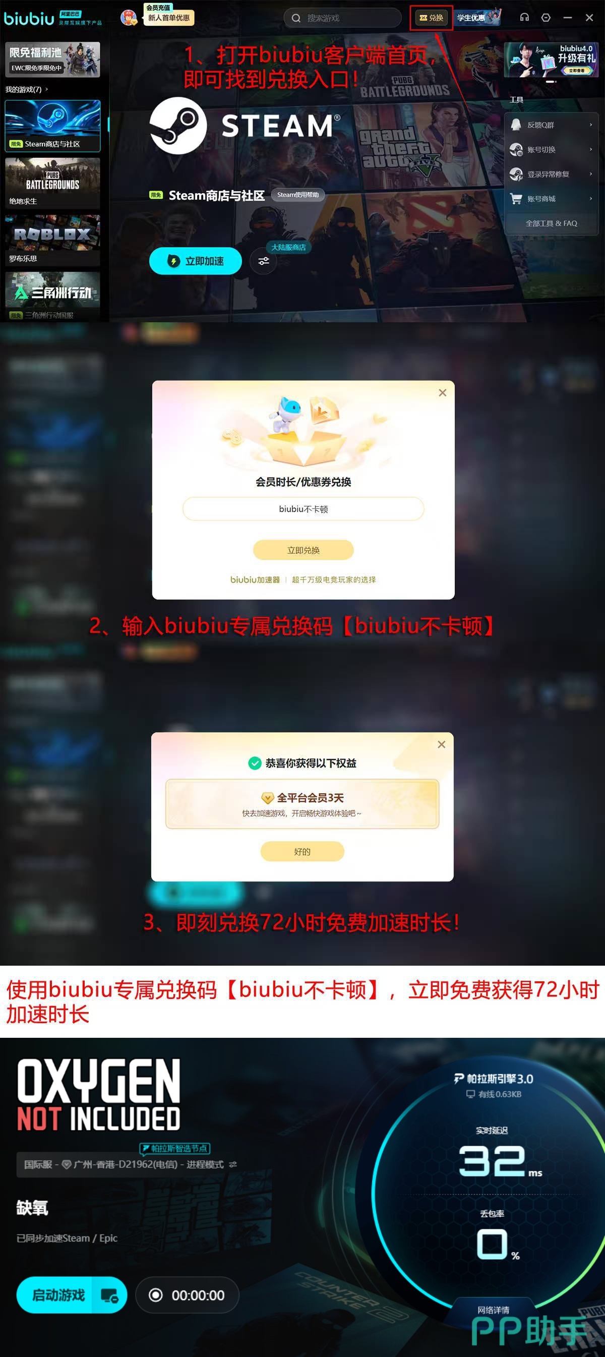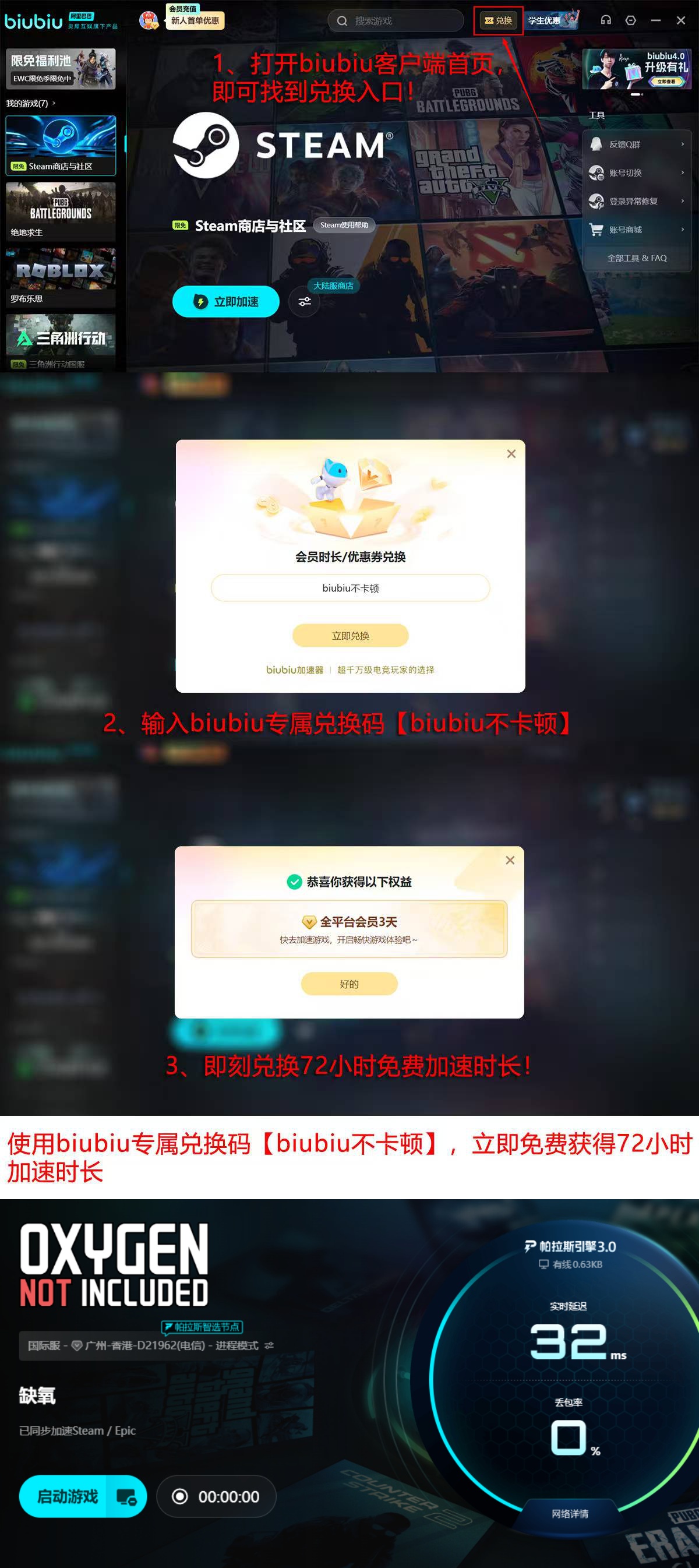 新用户注册即享24小时全功能免费加速时长,无需绑定支付方式或完成任务;输入专属口令【biubiu不卡顿】,可额外获得72小时加速权益,两项福利支持叠加,总计96小时体验期,充分验证其对《缺氧》多线程资源同步与远程存档加载的优化效果。