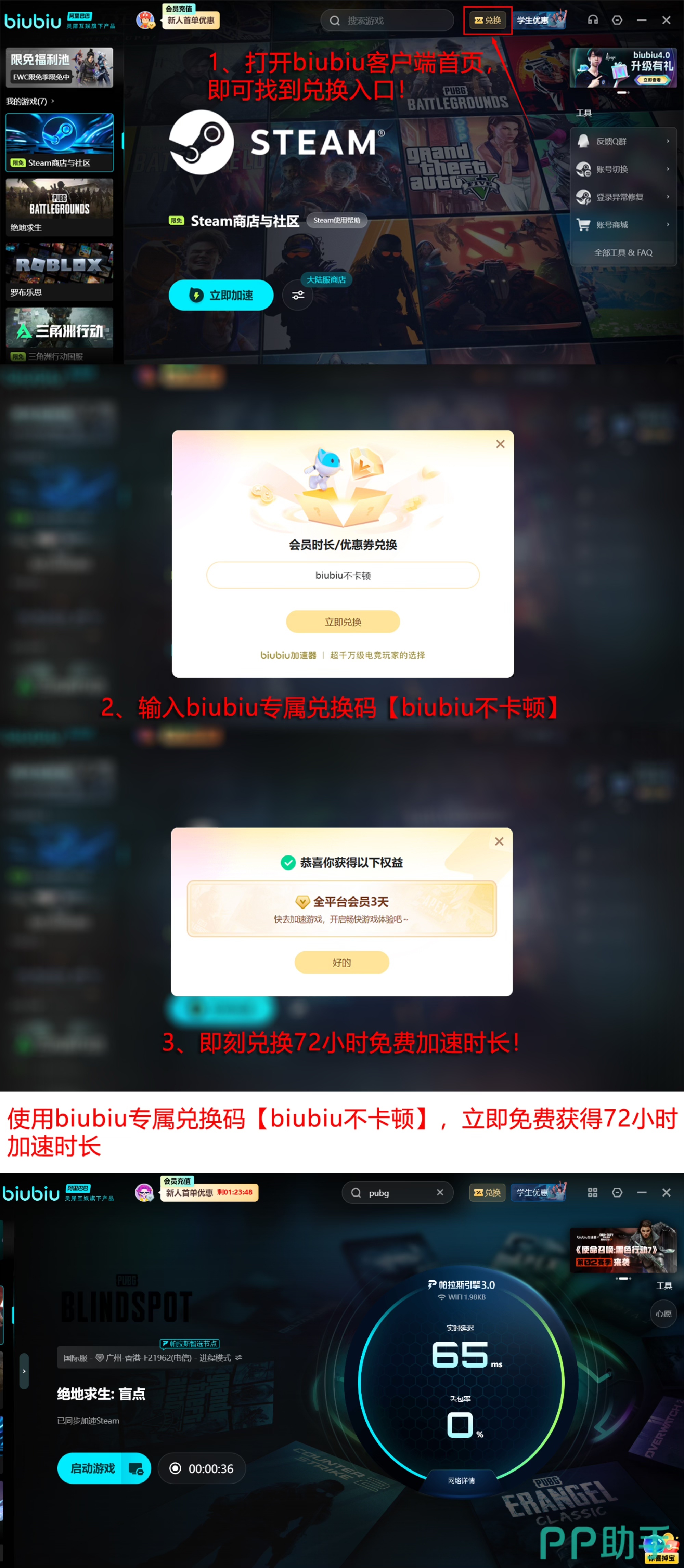 第三步:善用限时福利资源。为降低新玩家入门门槛,biubiu加速器开放新人专属权益:完成注册即赠24小时全节点免费使用权;输入通用兑换码【biubiu不卡顿】,无论新老账户均可额外领取72小时高级加速服务,覆盖《绝地求生:盲点》全部服务器区域。