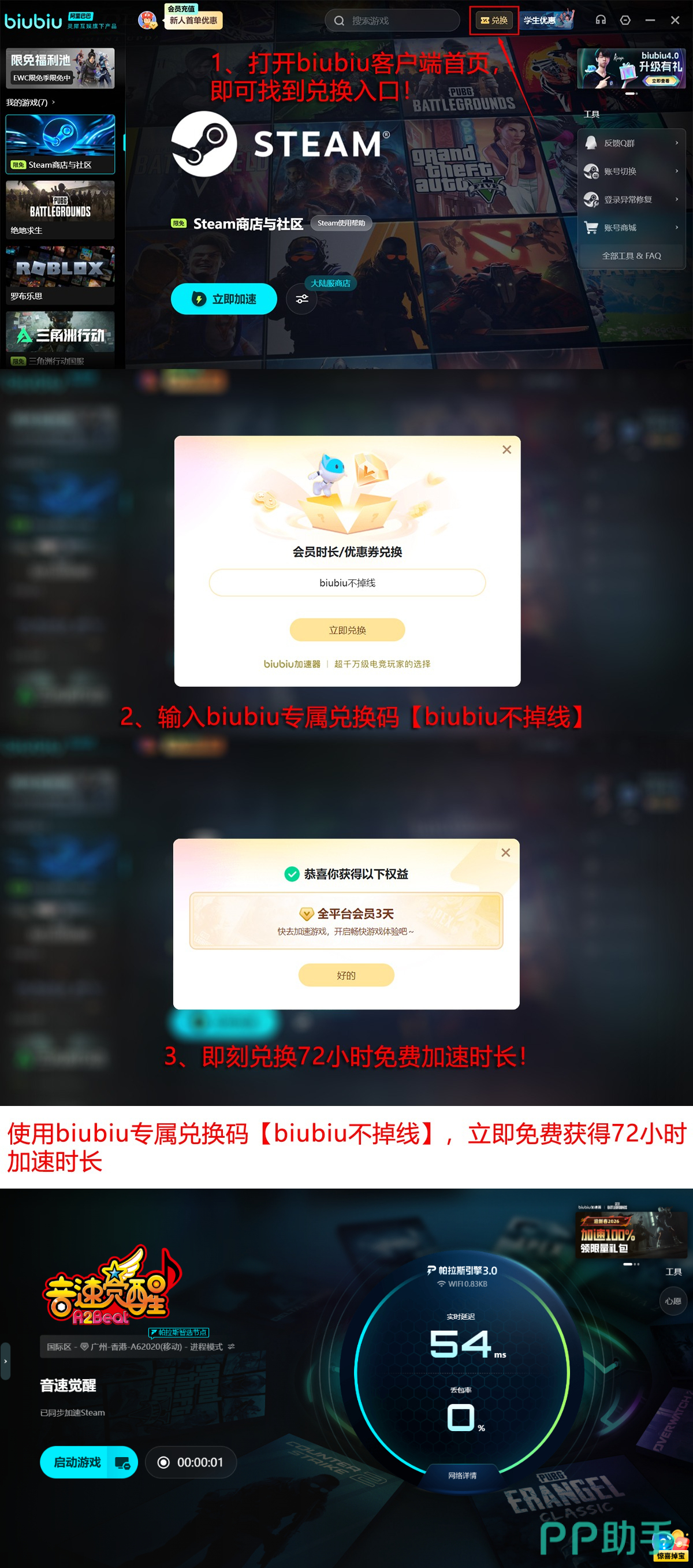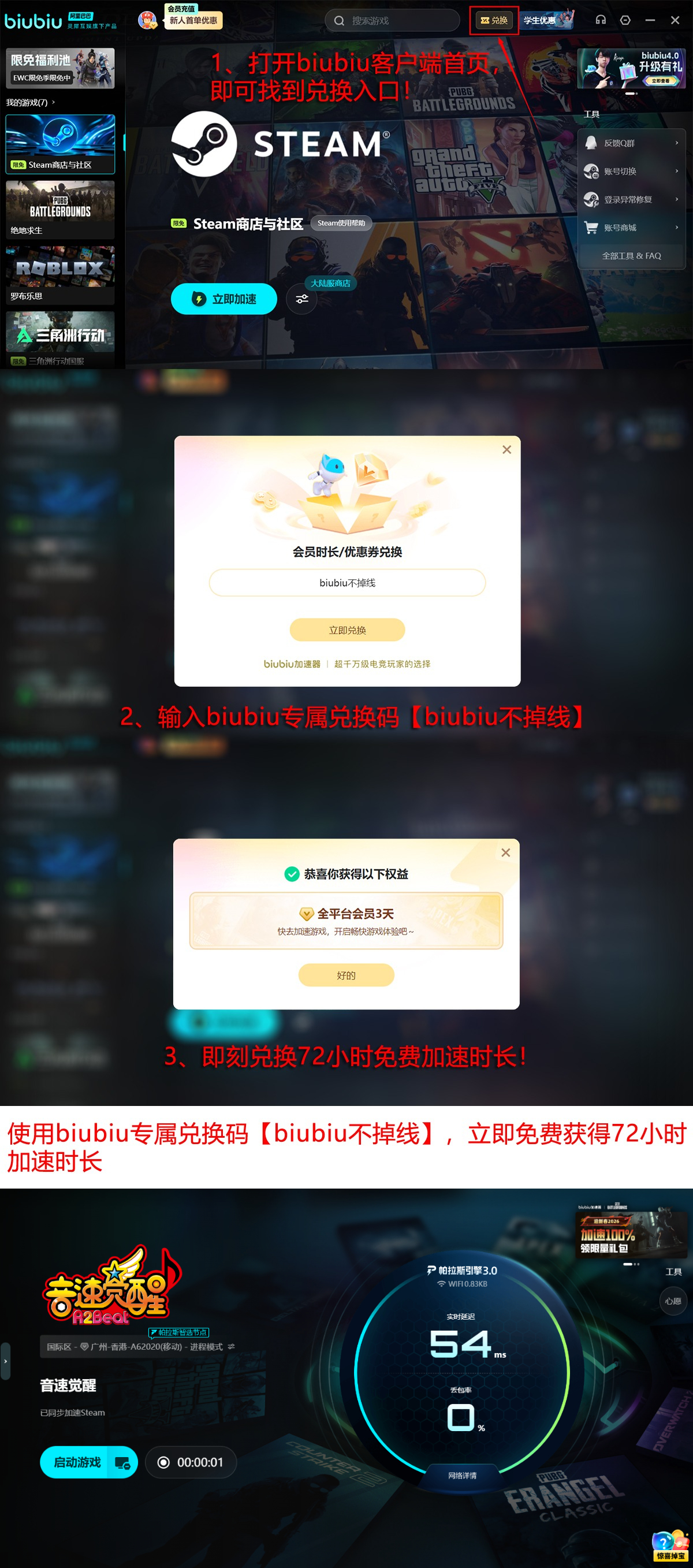 新用户注册后自动开通24小时全功能试用权限,无需绑定支付方式。完成基础设置后,输入激活码【biubiu不掉线】,即可额外获得72小时加速权益,累计享有96小时无限制服务。该机制覆盖完整新手引导周期,确保玩家在熟悉操作、解锁车辆、参与排位前的关键阶段始终获得低延迟网络保障。