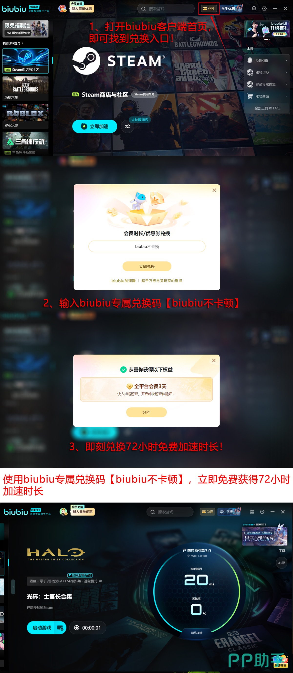 当前平台开放限时福利:新用户注册即赠1天加速时长;另附专属兑换码【biubiu不卡顿】,所有用户(含老用户)均可在biubiu加速器兑换中心输入领取额外3天免费使用权,累计享4天无门槛加速服务。