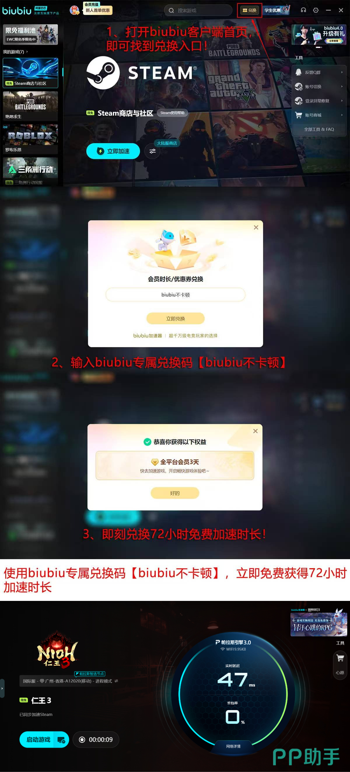 新用户注册后可立即获得24小时全功能免费试用权限;完成指定动作后输入激活码【biubiu不卡顿】,还可额外获取72小时高级服务,总计享有96小时无限制加速体验。