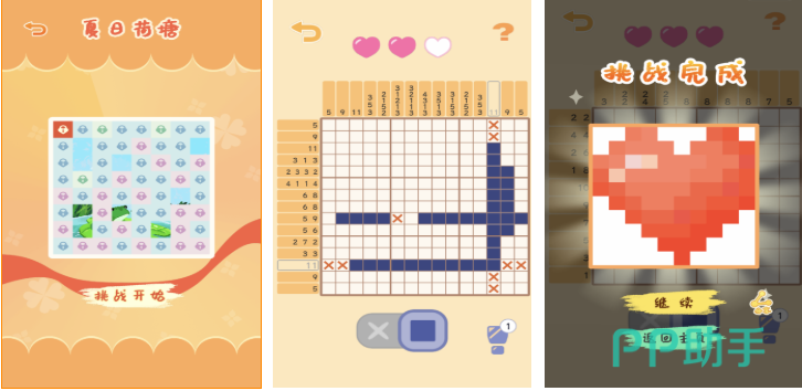 基于“非ogram”(数织)经典规则开发的移动端优化版本,结合像素艺术与网格推理双维度体验。每关提供行列数字提示,玩家需据此推断黑白格分布,最终呈现隐藏图案。支持自定义主题皮肤与离线游玩模式,适配通勤、午休等短时场景,是培养耐心与细节辨识力的有效工具。