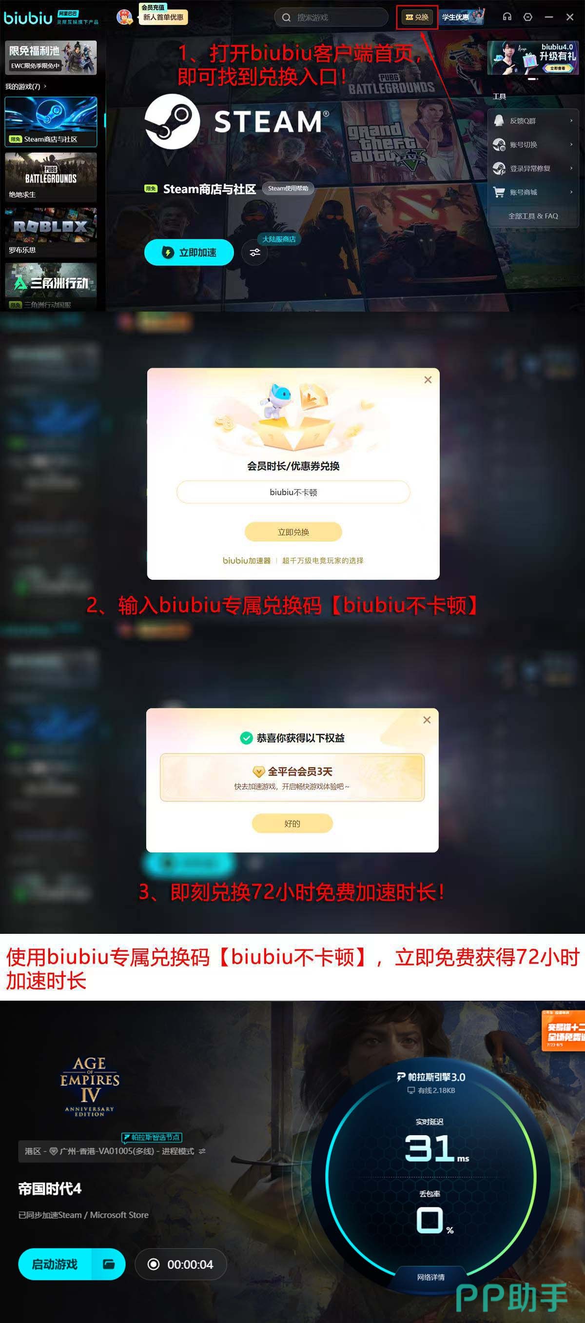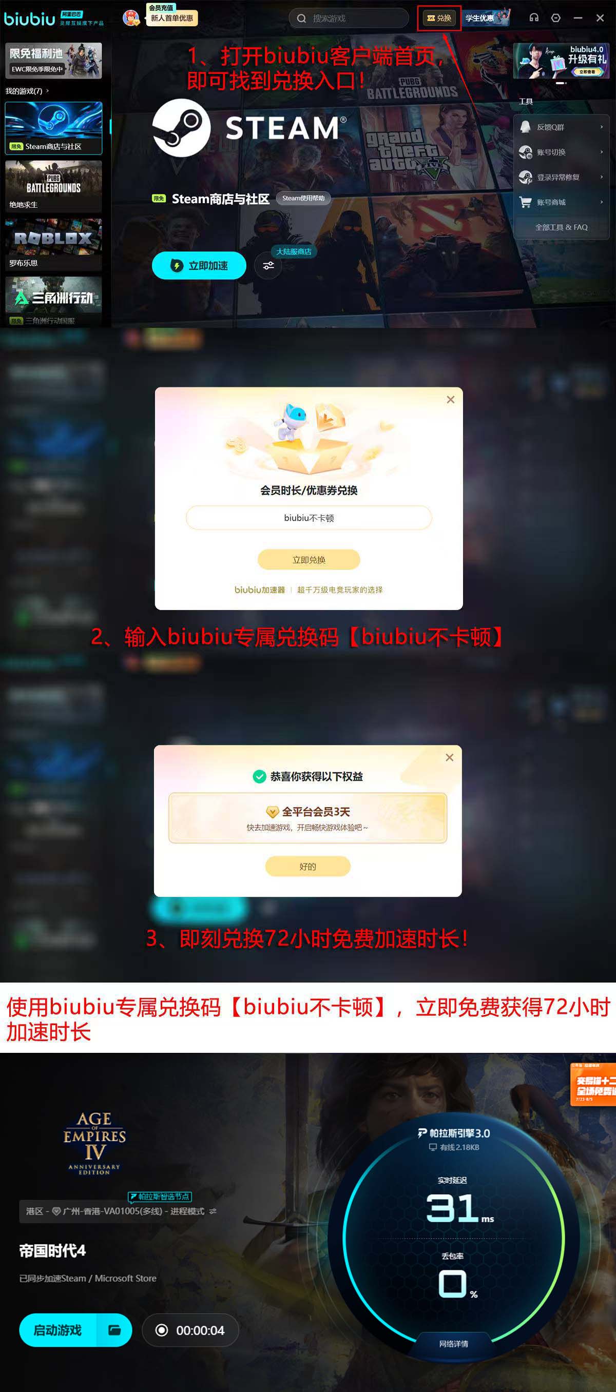 对于新注册用户,biubiu提供即开即用的轻量化服务:完成下载安装及账号注册全流程耗时不足3分钟,无需修改系统设置或关闭安全软件。目前开放双重时效福利——新用户注册成功后自动获得24小时免费体验时长;成为正式会员后,进入首页“兑换”入口,输入口令【biubiu不卡顿】,即可额外领取72小时加速权限,单账号累计可享96小时完整服务周期。