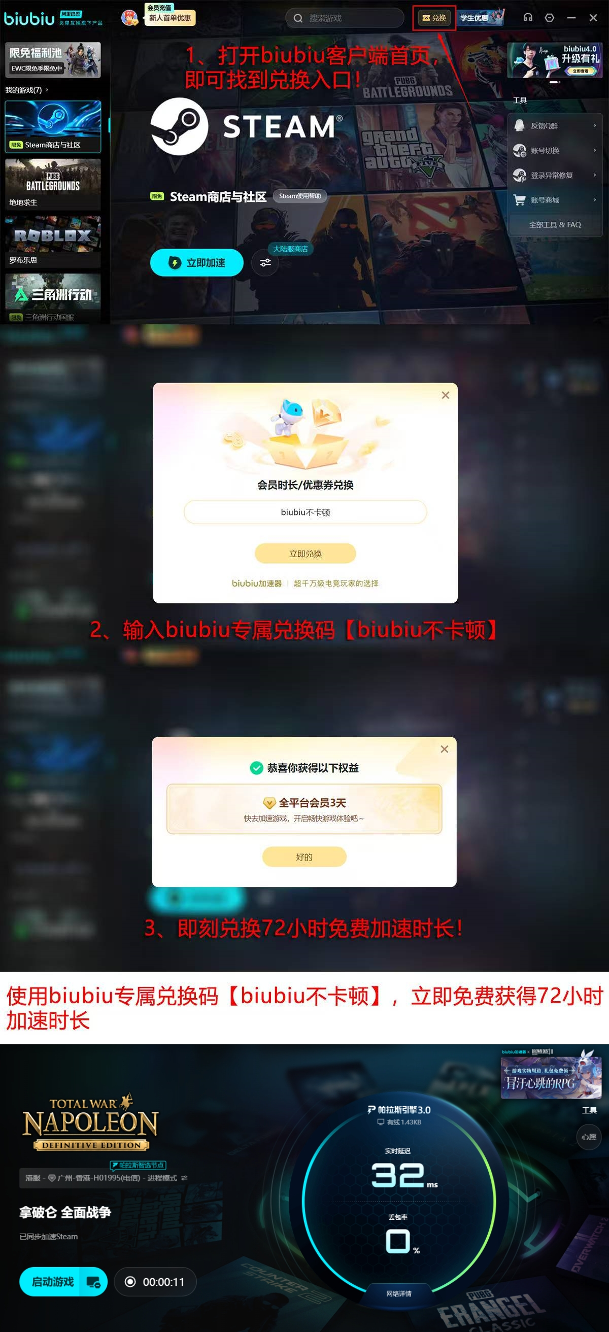该引擎已通过多款高敏感度竞技类游戏验证,包括与FPS职业选手xdd建立技术合作——其对网络延迟容忍阈值严苛,仅接受毫秒级波动控制,此合作侧面印证了帕拉斯3.0引擎在实时对抗场景下的可靠性。除性能表现外,biubiu加速器亦提供面向新用户的专项权益:输入兑换码【biubiu不卡顿】即可激活72小时全功能试用权限;若为首次注册用户,系统将自动叠加24小时额外时长,累计达96小时免费使用周期,覆盖中短期高频联机需求。同时,平台已适配涵盖《拿破仑:全面战争》在内的主流PC及主机模拟类游戏,游戏库持续更新,确保跨平台加速服务可用性。