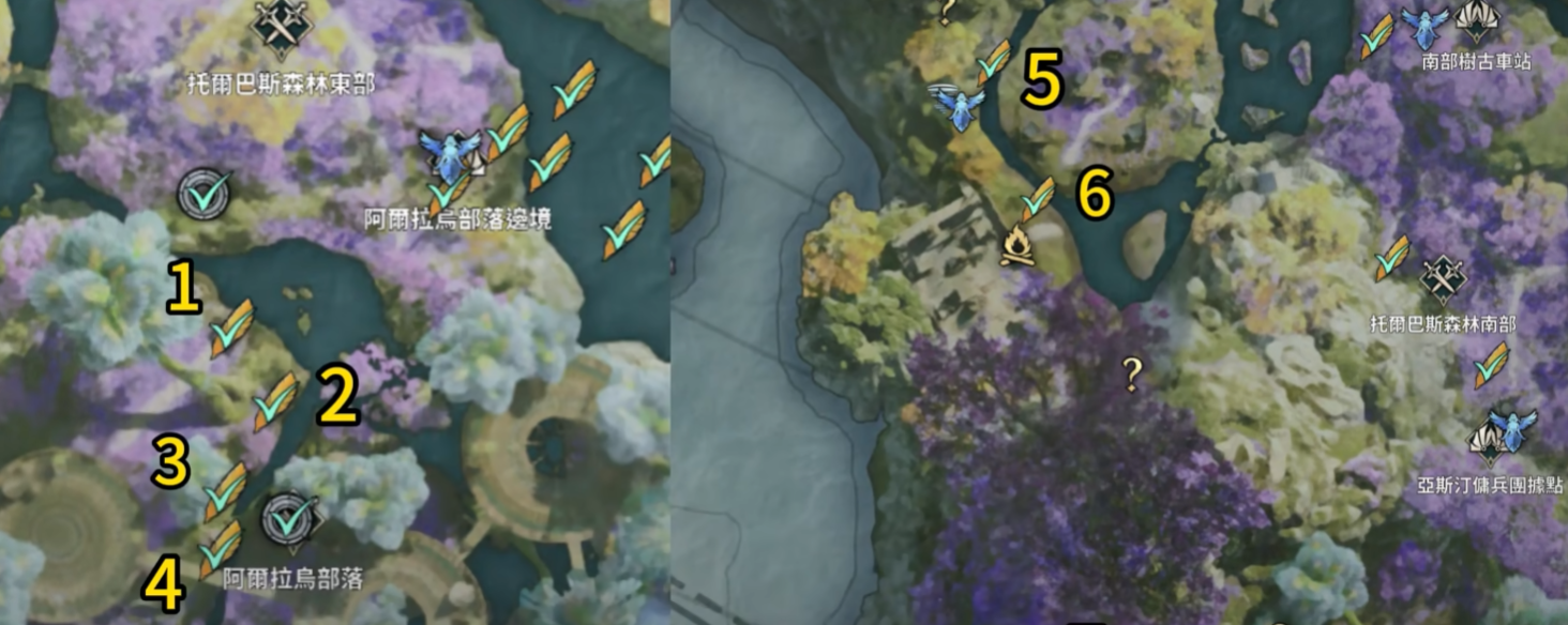 托尔巴斯森林共分布7枚主神痕迹,全部位于天族新手地图范围内,地形连贯、传送便捷,配合飞行能力可实现快速循环采集。具体点位如下: