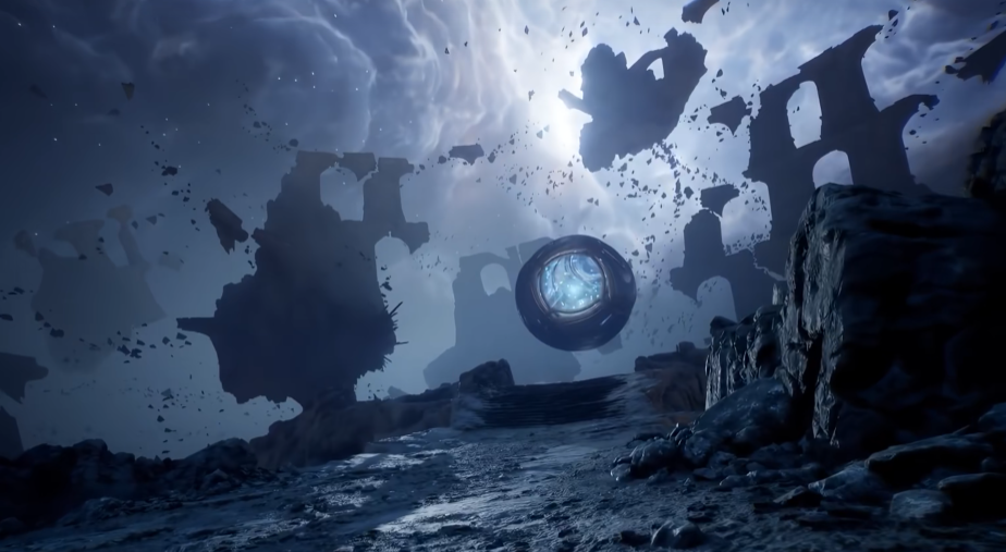 1、抵达森林初始传送点后转身仰角飞行,沿主路径向高处大树方向推进;抵达后左下角可见一扇古旧石门,首枚羽毛置于门框顶部横梁中央。