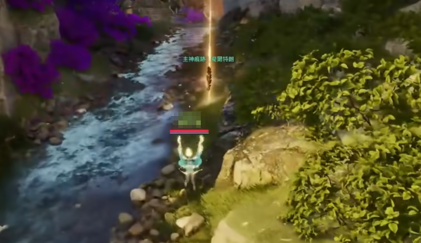 4、前行数十米后,溪畔岩石堆中有一处持续闪烁的金色光斑,落地即可直接拾取,无需跳跃或飞行,为全图最易获取点位。