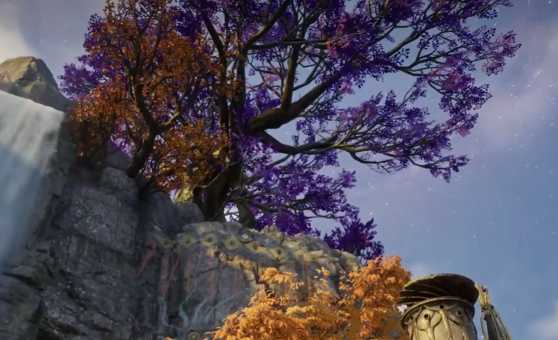 7、沿瀑布底部小径继续东行至尽头,抬头观察上方巨型紫冠古树;飞抵树根平台后,向右前方直行至断崖边缘,第七枚羽毛静置在突出岩台最前端的风蚀石柱顶端。