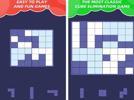 由海外开发团队打造,采用固定棋盘+自由摆放式消除机制。屏幕中央显示目标图案,底部滚动栏提供随机形状方块(含凸起/凹槽结构),玩家需将方块精准嵌入指定位置完成闭合消除。全游戏共设128个关卡,前32关以直角结构为主,后续关卡逐步引入斜角切割、镜像对称等复杂几何约束,符合国际智力游戏难度分级标准(IQG Level 3-5)。