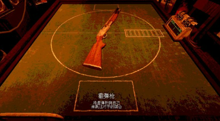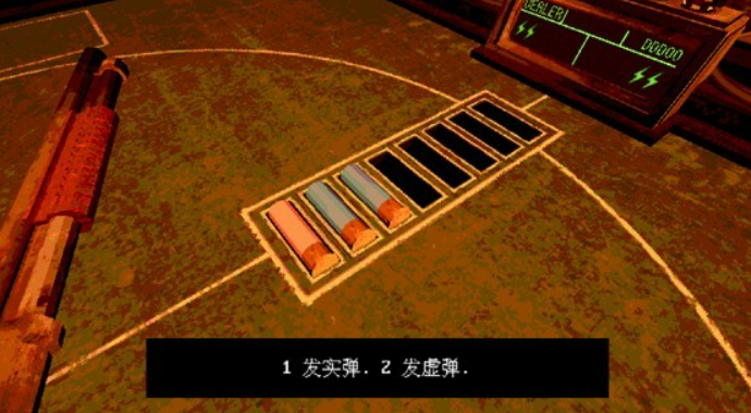 游戏最开始的时候,玩家会进入一个昏暗的房间,然后和恶魔坐在桌子两边。桌上摆着一把霰弹枪,这把枪就是整个对局的核心。恶魔会往枪里装子弹,有实弹也有空包弹,数量每轮都不太一样。比如第一轮,可能是两发空包弹加一发实弹,后面难度上来了,实弹会变多。装好子弹之后,双方就开始轮流选择开枪的目标,可以朝对方开,也可以朝自己开。
