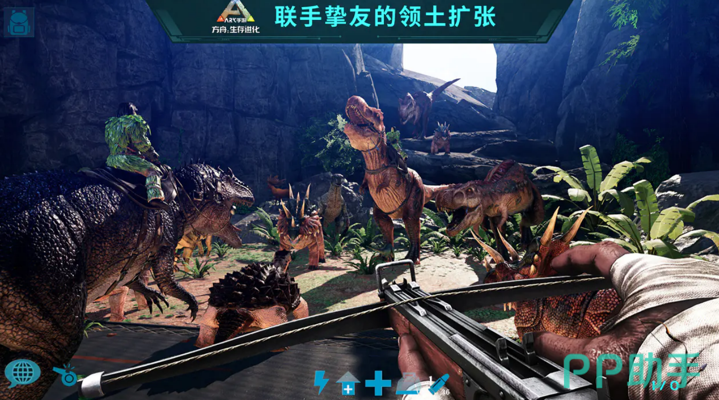 游戏中收录超百种可交互生物,涵盖迅猛龙、三角龙、剑龙、雷龙、霸王龙及翼龙等标志性史前物种。所有生物均具备独立AI行为逻辑,既可作为威胁存在,亦可通过投喂、击晕、驯化等步骤纳入己方阵营。成功骑乘翼龙翱翔天际,或驾驭暴龙突破敌方防线,均带来极强的操作满足感与战术延展性。
