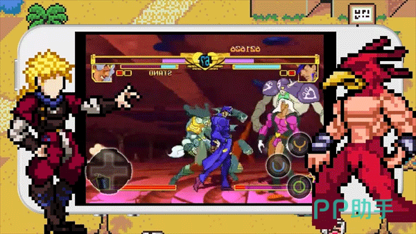 本作将经典2D格斗框架与替身系统深度融合,玩家可在任意战斗时刻召唤专属替身,实现远程压制、近身突袭或双线牵制。替身与本体可同步行动,形成战术配合;独创的姿态切换系统依托方向键组合触发标志性连段,动作辨识度高,还原原作战斗语境。