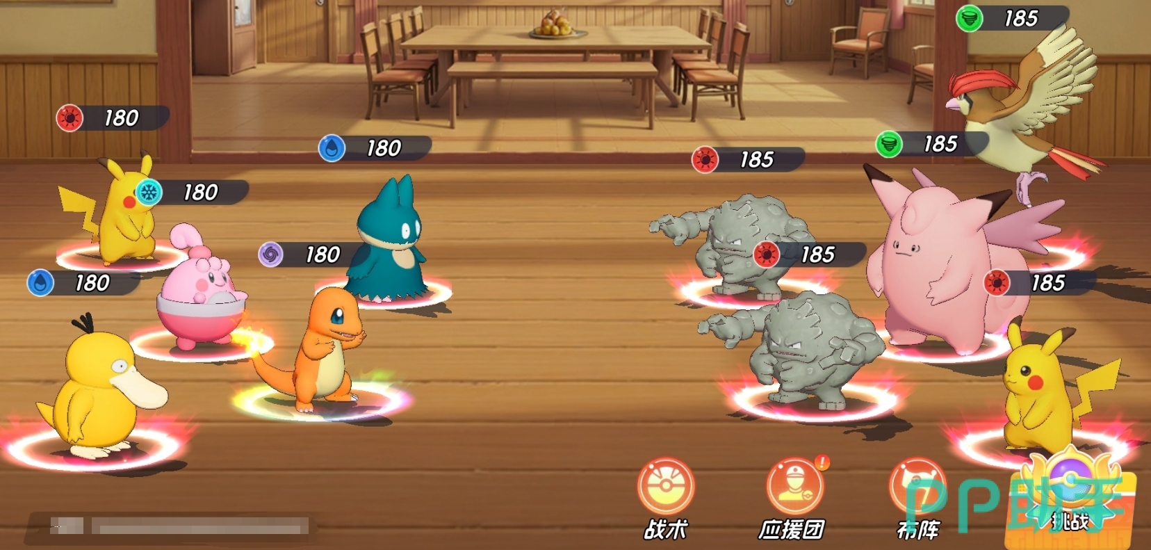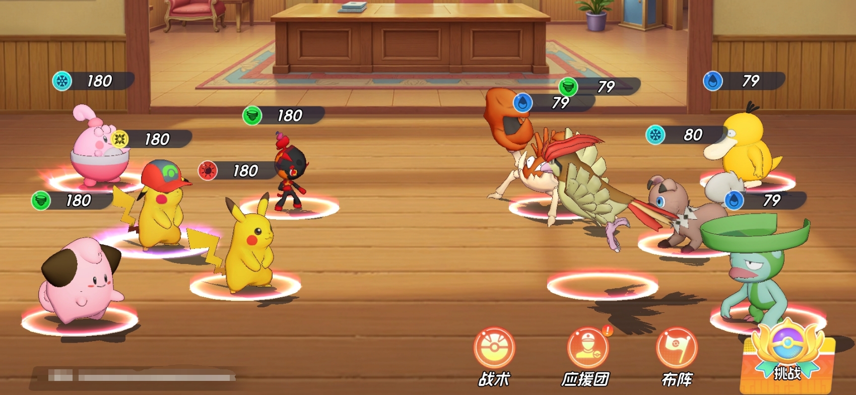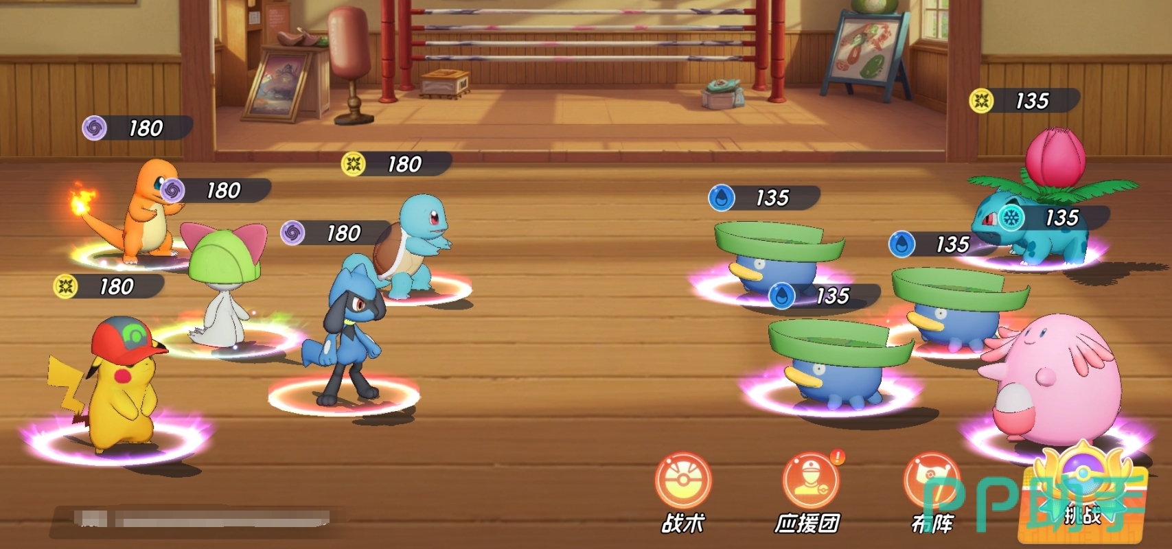 由帽子皮卡丘、皮卡丘、炭小侍、皮宝宝、小福蛋组成。该组合聚焦高频群攻与持续控场:两位皮卡丘共享电系核心机制,大招联动可触发高额范围伤害;小福蛋与皮宝宝构成双辅助轴心,提供群体眩晕+稳定治疗,保障输出环境;炭小侍担任前排主力,兼具承伤能力与可观单体输出,亦可依实际需求替换为其他高耐久防御型宝可梦。