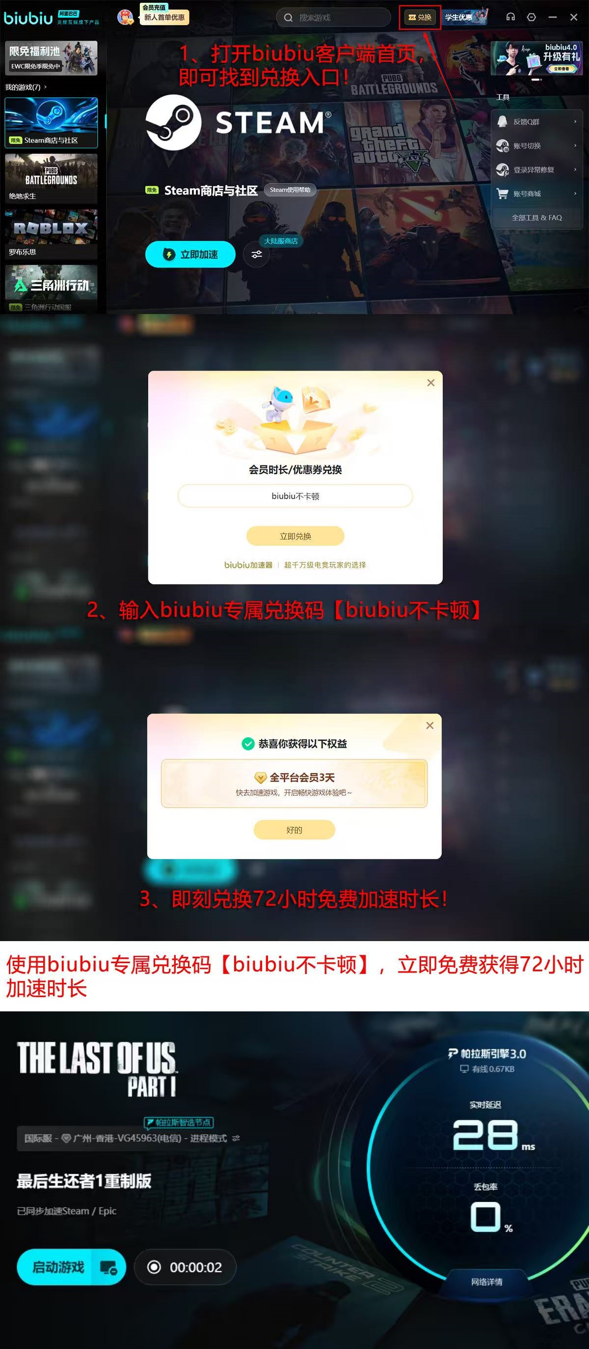 新用户注册即享24小时全功能免费试用;访问指定页面输入专属口令“biubiu不卡顿”,可额外激活72小时连续加速权限。两项权益可叠加生效,首期实际可用时长达96小时(即4天)。