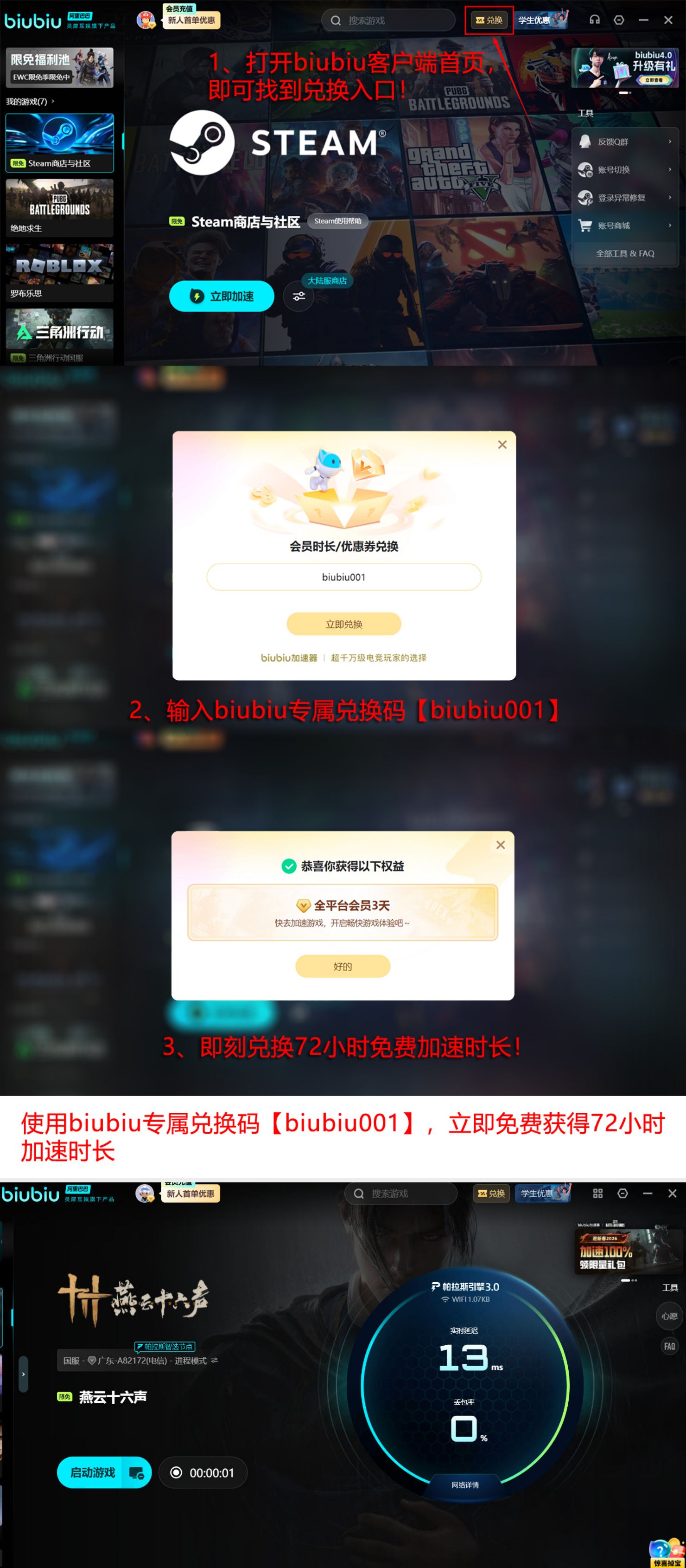 目前平台面向全体用户开放限时福利活动:输入兑换码【biubiu001】即可领取三天免费加速时长;新注册用户额外获赠24小时专属权益,完成首登后总计可叠加使用达96小时,全程无需付费订阅。