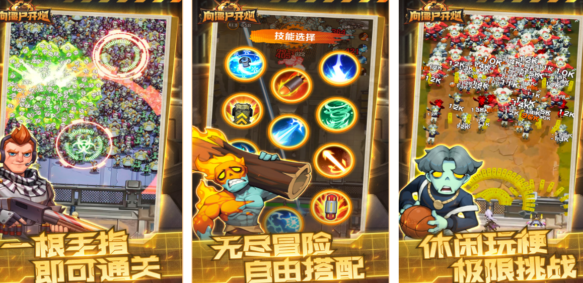 《向僵尸开炮》把非常爽快的射击解压和割草博弈做得非常地道。玩家扮演着要突破广袤荒野、在布满路障、废弃油桶、腐烂建筑的交通枢纽地段里争夺生存半径、积累功勋的特战精英。游戏上手简单,玩家只需要点击屏幕就能用角色手中的自动步枪锁定远处的异变体,用重型手雷去清理雷区。当玩家被数倍于己的敌人围困时,需要极其精准地走位调遣来保证自家的射程能够覆盖住每一个角落。