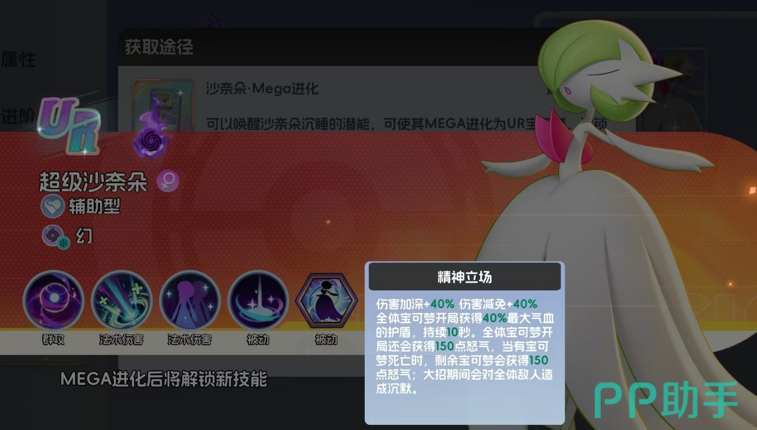 超级沙奈朵完整继承拉鲁拉丝的基础特性,并在MEGA化后显著强化其战略价值。其核心技能“黑洞”可生成持续区域效果,范围内敌方单位移动速度与攻击速度均降低90%,同时触发沉默效果,有效打断关键技能释放。该技能不仅具备强控场能力,还能为队友创造安全输出环境。此外,它拥有群体治疗技能“魔法闪耀”,可为全体友方单位恢复生命值;当自身受到威胁时,可发动幻象嘲讽吸引火力,并通过瞬移脱离危险距离,生存能力突出。被动方面,超级沙奈朵开局即获得100点怒气,并提升全队12%攻击力,这一设定使其从战斗起始便具备节奏主导权。