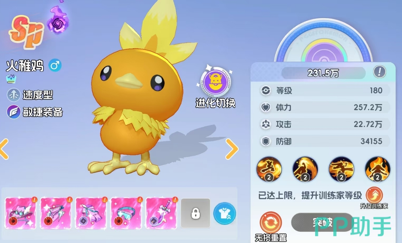 值得注意的是,超级火焰鸡的获取路径具有明确前置条件:玩家需先将初始为月亮1阶的火稚鸡累计升阶16次,以激活MEGA进化资格;待MEGA兑换商店开启后,使用指定进化卡完成转化,方可使火稚鸡由SP品质跃升为UR品质。由于火稚鸡本身属于获取难度极高的SP级宝可梦,且升阶过程需消耗大量同名个体,整体培养周期长、资源投入大。建议玩家合理规划资源储备节奏,避免因急于成型而影响整体养成进度。