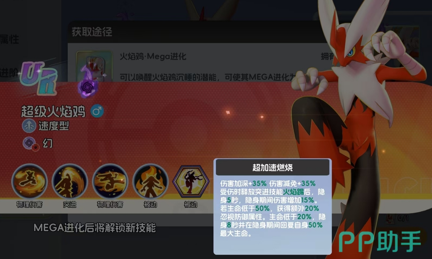 超级火焰鸡完整继承火稚鸡初始携带的四个基础技能,并在成功达成MEGA进化后,额外解锁专属机制——“超加速燃烧”。该机制初始提供5%的全伤害加成与所受伤害减免;当MEGA进化等级提升至满阶(上限),该效果将强化至35%加成与减免。更关键的是:在战斗中,若超级火焰鸡处于受伤状态并释放“火焰踢”,将立即触发隐身效果,持续5秒;隐身期间,除基础增益外,还将叠加额外属性强化,显著提升其突袭敌方核心输出位的稳定性与容错率,兼顾生存与切入效率。