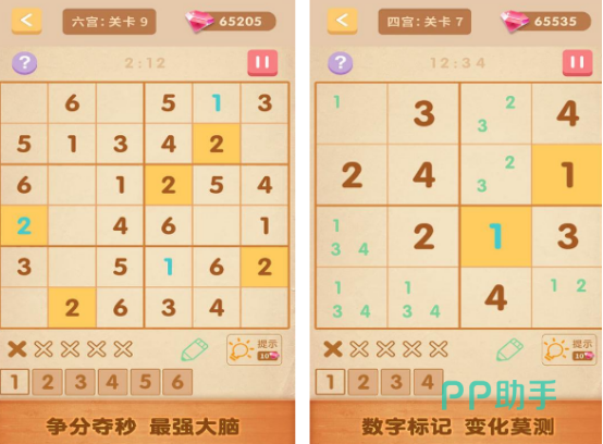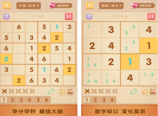 孩子也可以通过这一款锻炼脑筋的游戏进行体验,尤其是简单的四宫格,需要在每个宫格当中填写一到四这样的数字,如果没有重复的情况下就可以取得胜利。除此之外,还有难度更大的关卡,比如六宫格以及九宫格,难度挑战也会有一些区别,在每个关卡当中都会提前的给出几个数字,需要根据具体的情况,发挥自己的智慧完成闯关。